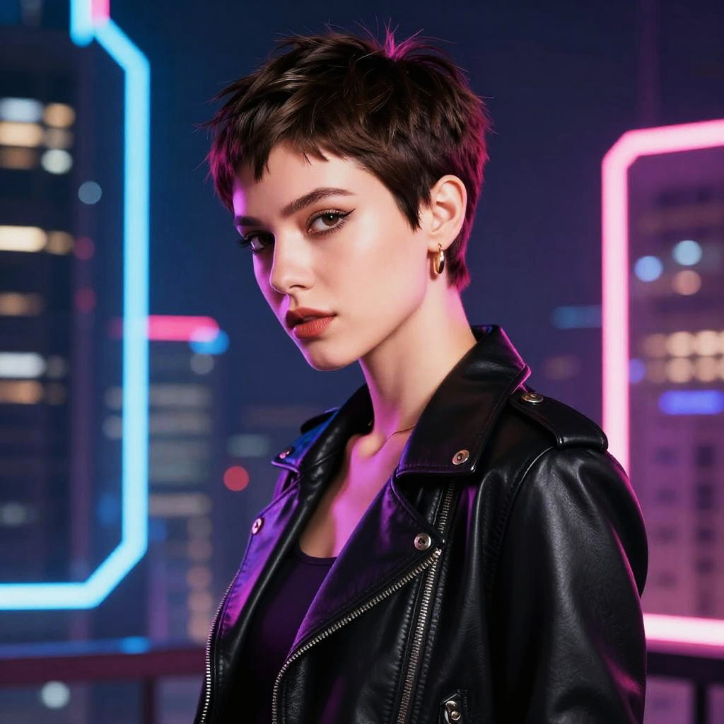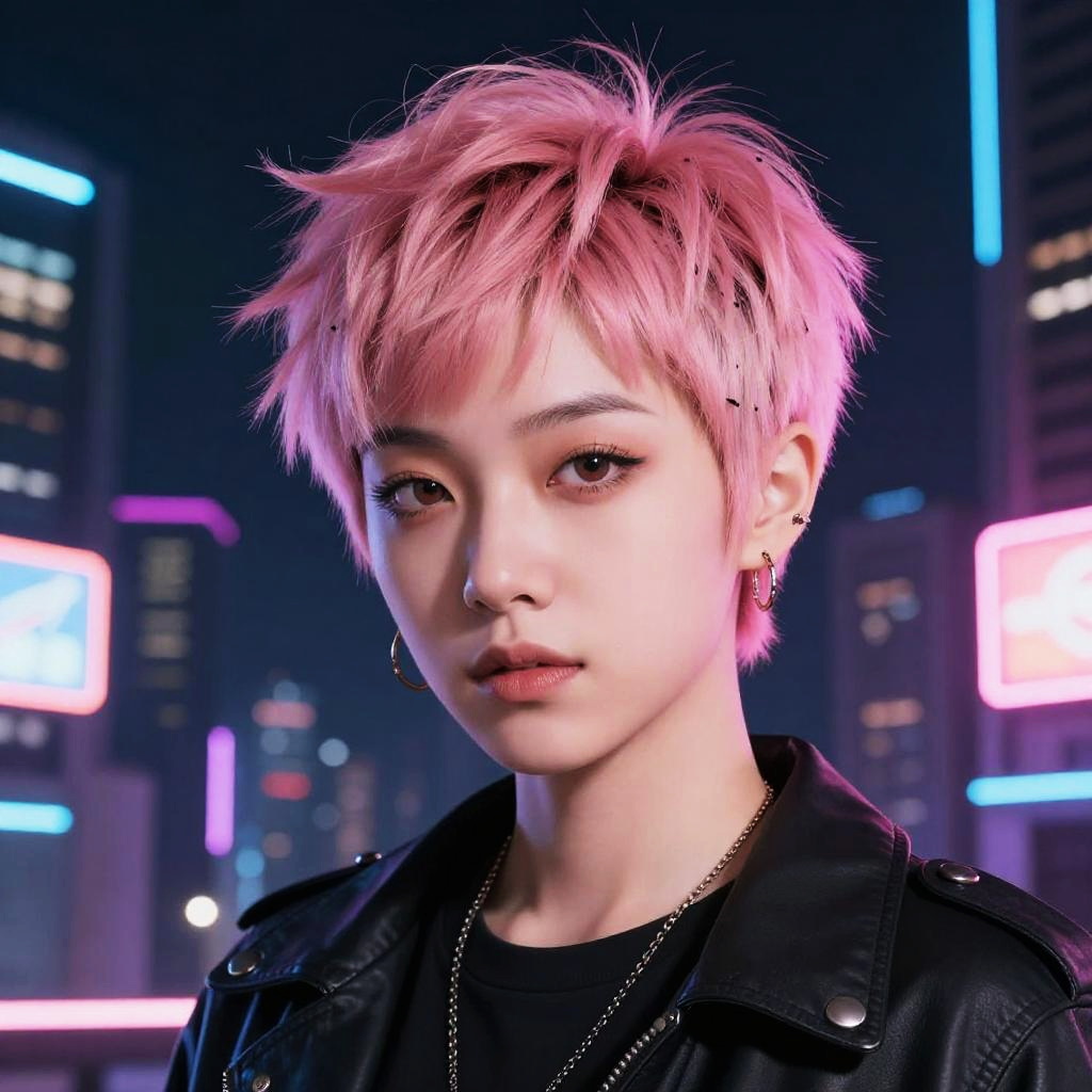 Pixie cut pink hair styled with edgy layers, neon cityscape at night, cyberpunk vibe, high contrast lighting, expressive and bold character portrait