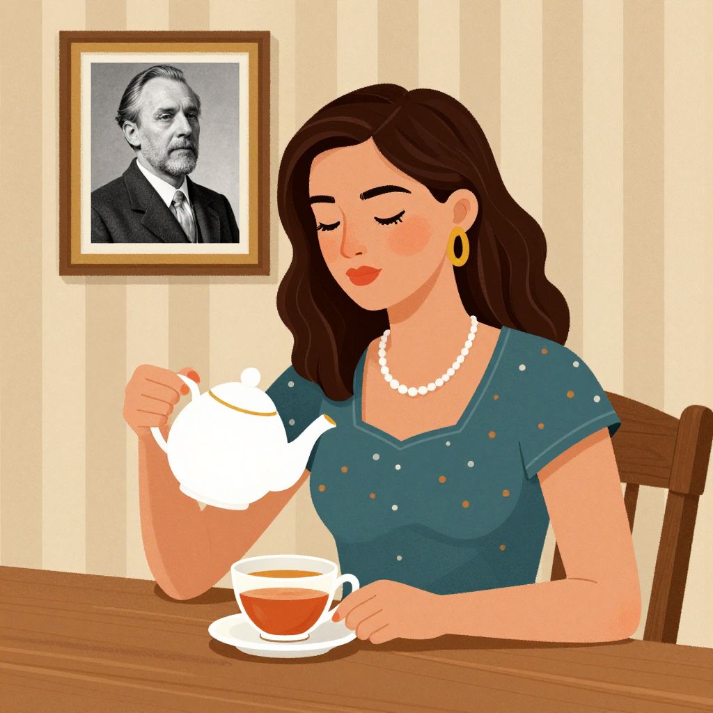 A vibrant digital illustration depicts a woman seated at a wooden table, enjoying a moment with a teapot and a cup of tea, set against striped wallpaper and a framed black-and-white portrait in the background, showcasing a blend of realism and stylized detail.