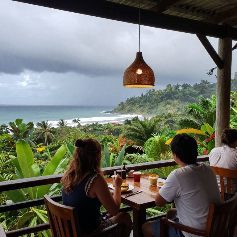 "Crew el avion restaurant in manuel antonio costa rica, overlooking the jungle and bay below, rain and storms in the distant sea, breath of the wild art style with influences from final fantasy,"