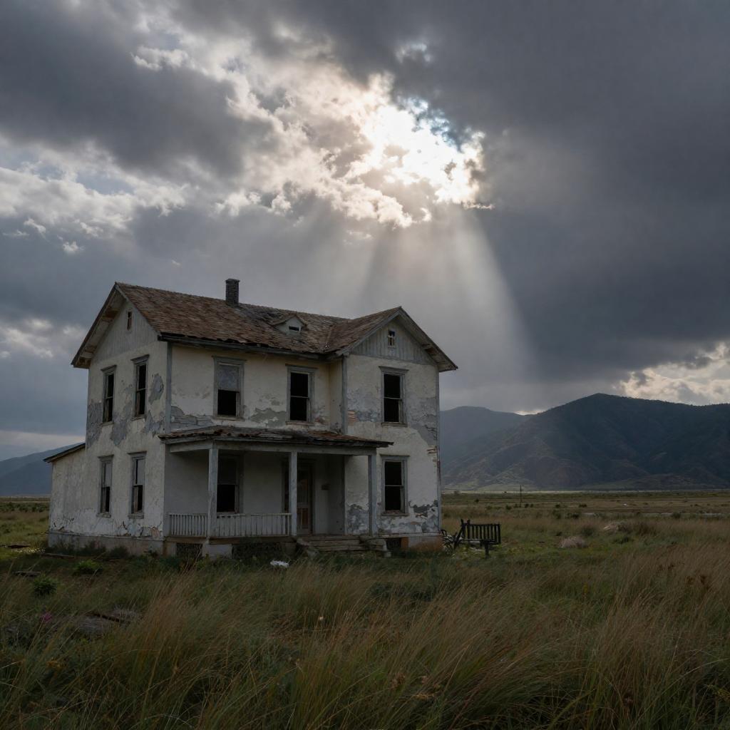 Photograph of an old, two-story abandoned house with peeling paint standing in a grassy field. The house features a small porch and multiple windows, some without glass. Dark, shadowy mountains are visible in the background under a dramatic cloudy sky with bright sunlight breaking through.