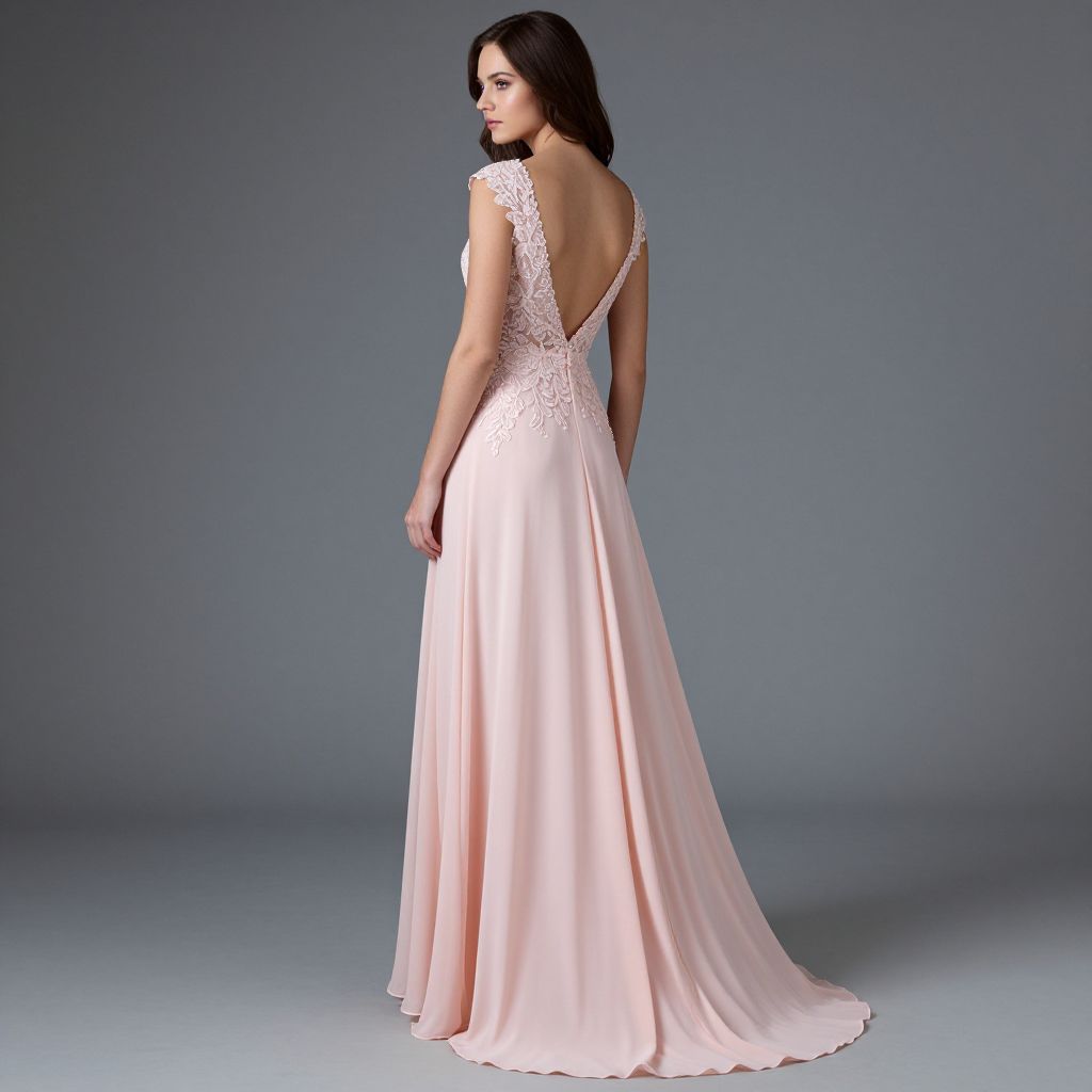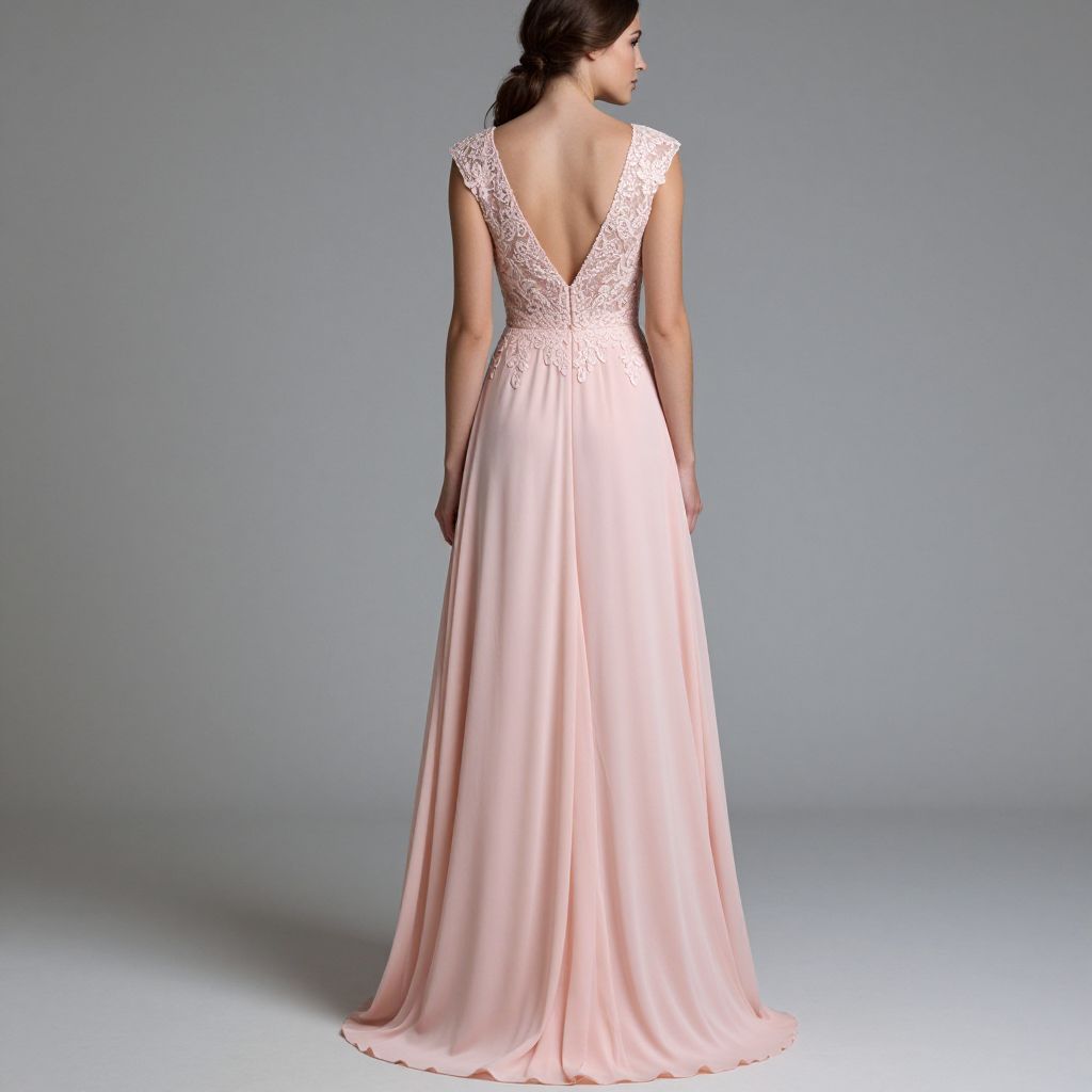 Elegant woman showcasing a floor-length prom dress featuring a delicate pink chiffon fabric with intricate lace appliqués adorning the bodice, paired with a deep V-back design and flowing skirt that gracefully drapes to the ground.