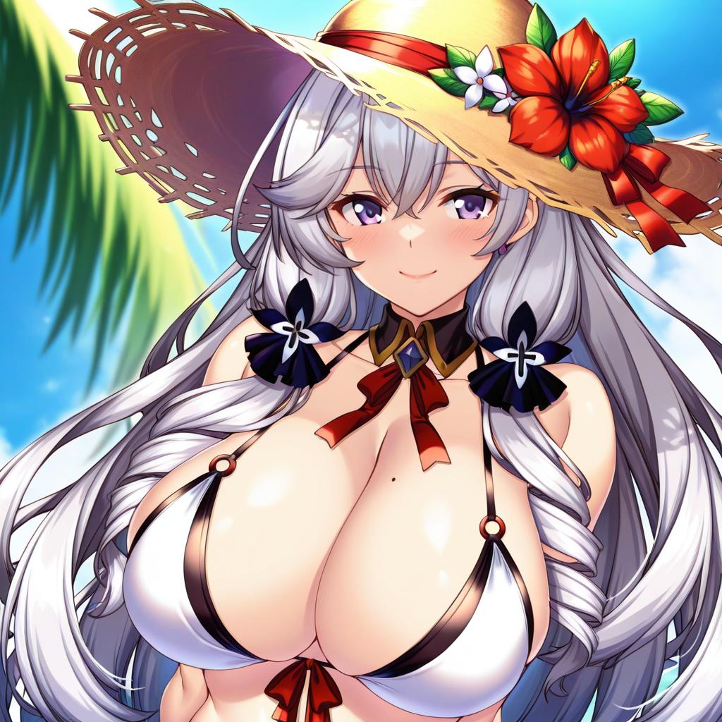 Algerie (azur lane), azur lane, 1girl, purple eyes, hair between eyes, mole under eye, grey hair, long hair, very long hair, white hair, large breasts, mole on breast, cleavage, white bikini, two-tone bikini, straw hat, hat flower, bare shoulders, twin drills, drill sidelocks, by artist shirokuma a, illustrious