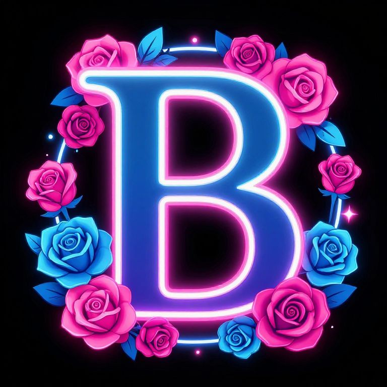 Inbetween visual novel illustrated logo with the letter B. neon colored border with neon pink and blue roses. novel graphic illustraition ar 1:1,