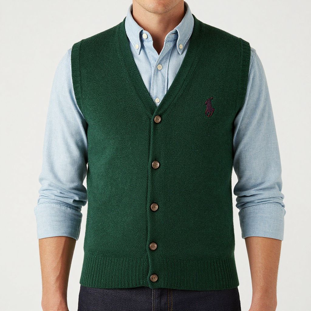Photograph of a man's torso showing a light blue, button-down shirt with the sleeves rolled up, paired with a dark green, knitted vest. The vest has a textured pattern and is buttoned down the front with dark brown buttons. A small, dark blue embroidered emblem is visible on the vest's left side. The background is plain white, making the clothing the focal point. The man's skin tone is light, and his face is partially visible but not fully shown. The image is sharply focused, highlighting the textures and colors of the clothing.