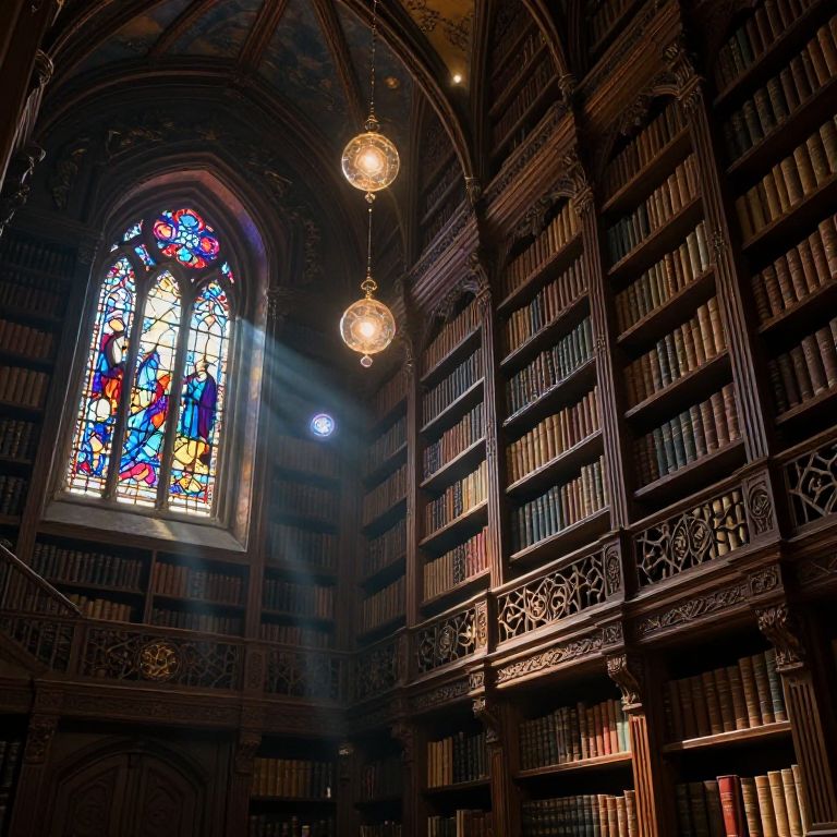 Photograph of a grand, dimly lit library with Gothic arches, ornate wooden bookshelves, colorful stained glass window, and three hanging