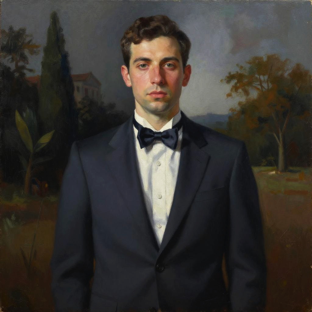 Realistic photo.a painting of a man in a tailored suit with a bow tie, Donato Giancola, pop surrealism, extremely detailed oil painting, dramatic contrasts, surreal surroundings realistic photo