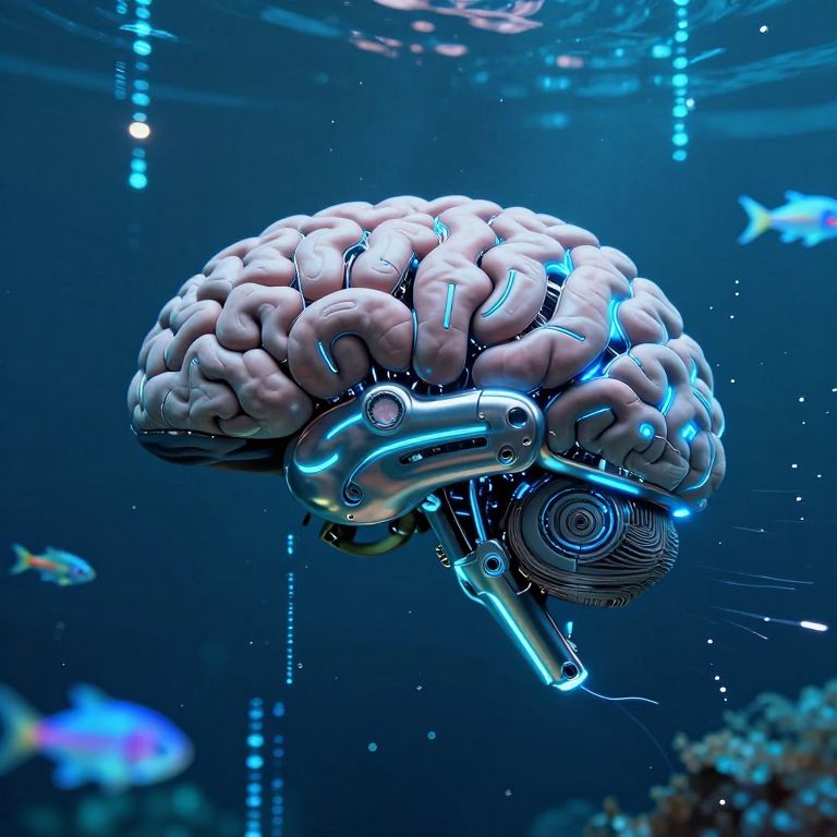 Digital artwork of a futuristic, cybernetic human brain with glowing blue circuits, floating underwater among colorful fish and coral.