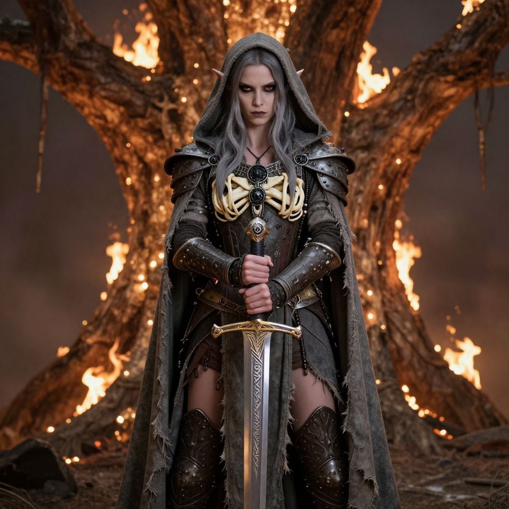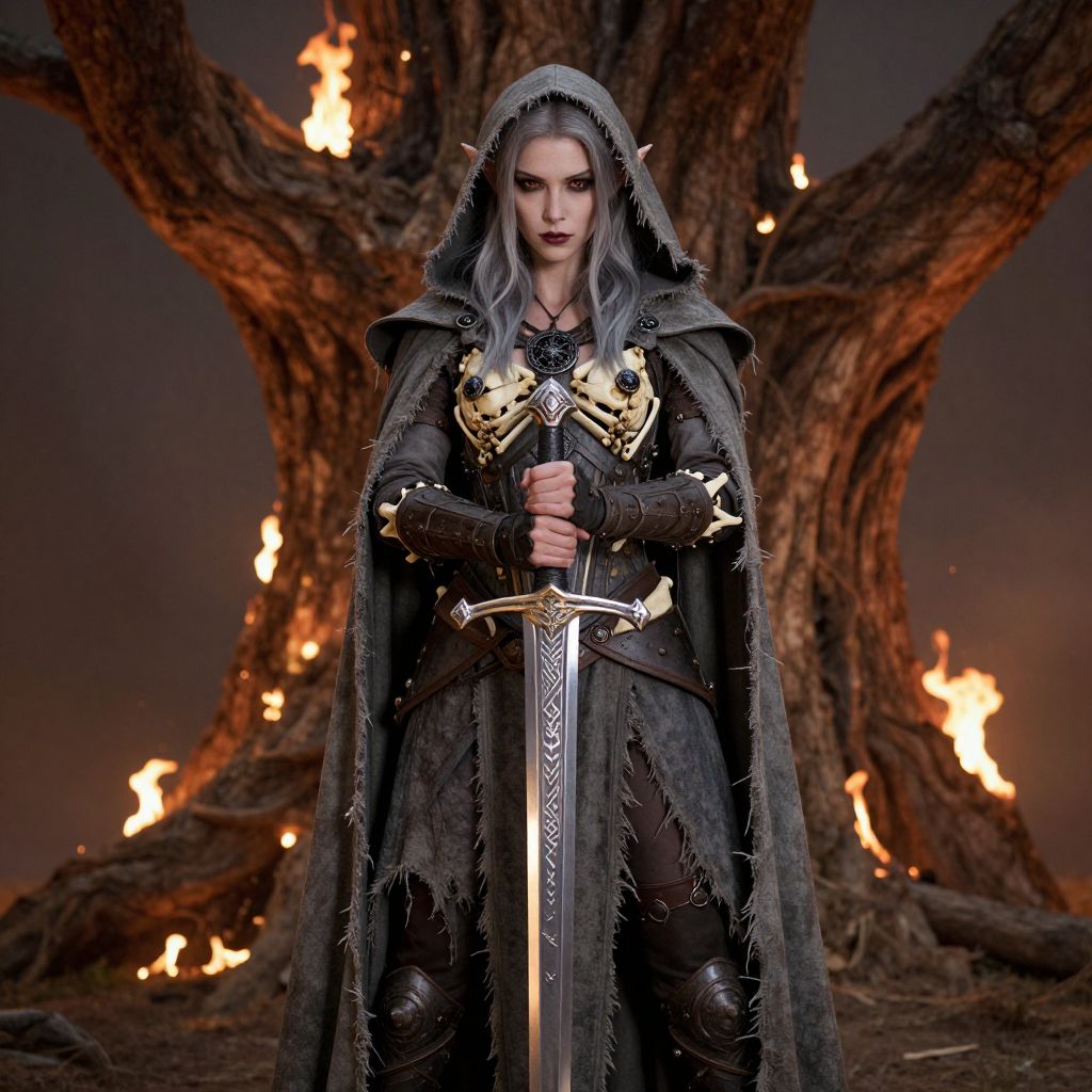 Elf girl, elf warrior, dark elf, drow, bone armour, wearing armour made of bones, unholy black ornaments, mystic jewelry, standing upright, holdind a shining sword, sword is ornate and covered with runes, wearing tattered cloak and hood, intimidating aura, background is a giant burning tree, atmoshere of image is tragic and epic, The style is ethereal and artistic, soft lighting and shadows, cinematic warm lighting, female, 1girl, gray hair, long hair, pale skin, red eyes, gray cloak, holds sword, the character is charismatic and unholy, cowboy shot