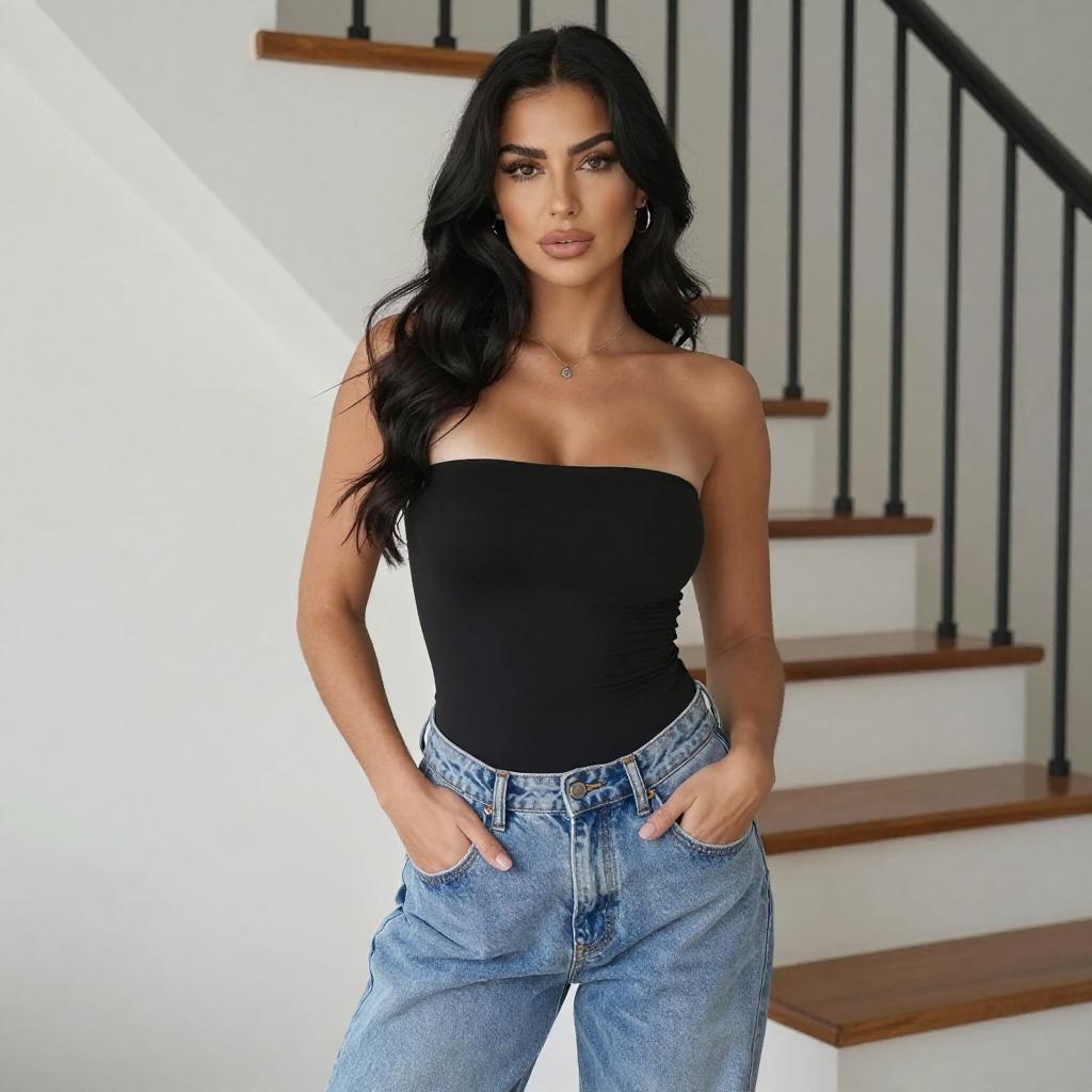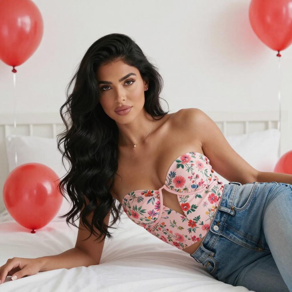 Photograph of a woman with long, wavy black hair, wearing a pink floral strapless top and blue jeans, reclining on a white bed. Red balloons hang in the background. She has a tanned complexion, full lips, and a confident expression. The setting is a bright, minimalist bedroom.