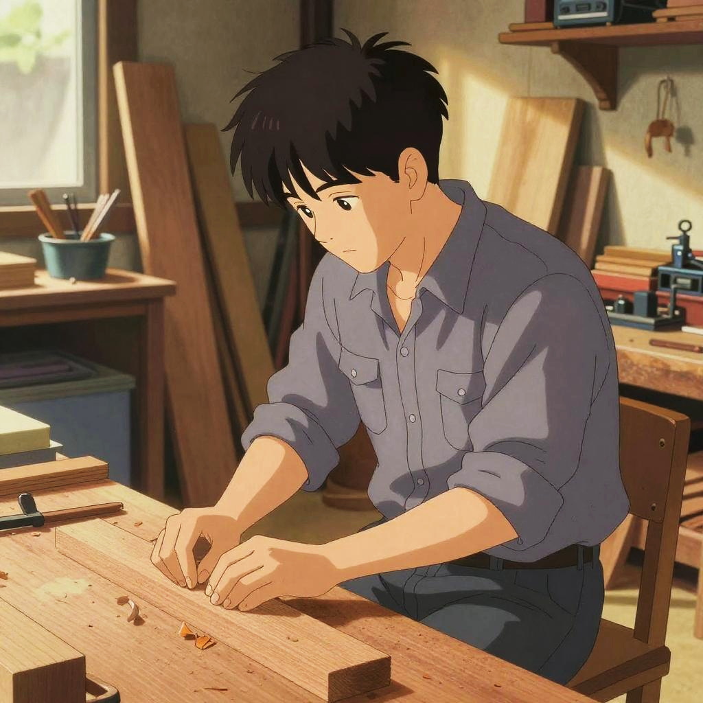 Illustration of a focused young woodworker in a bright, sunlit workshop. The figure wears a white work shirt with rolled-up sleeves and dark trousers, seated on a wooden bench surrounded by woodworking tools, wood shavings, and wooden planks. The scene captures a nostalgic, atmospheric manga style with warm sunlight streaming into the room.
