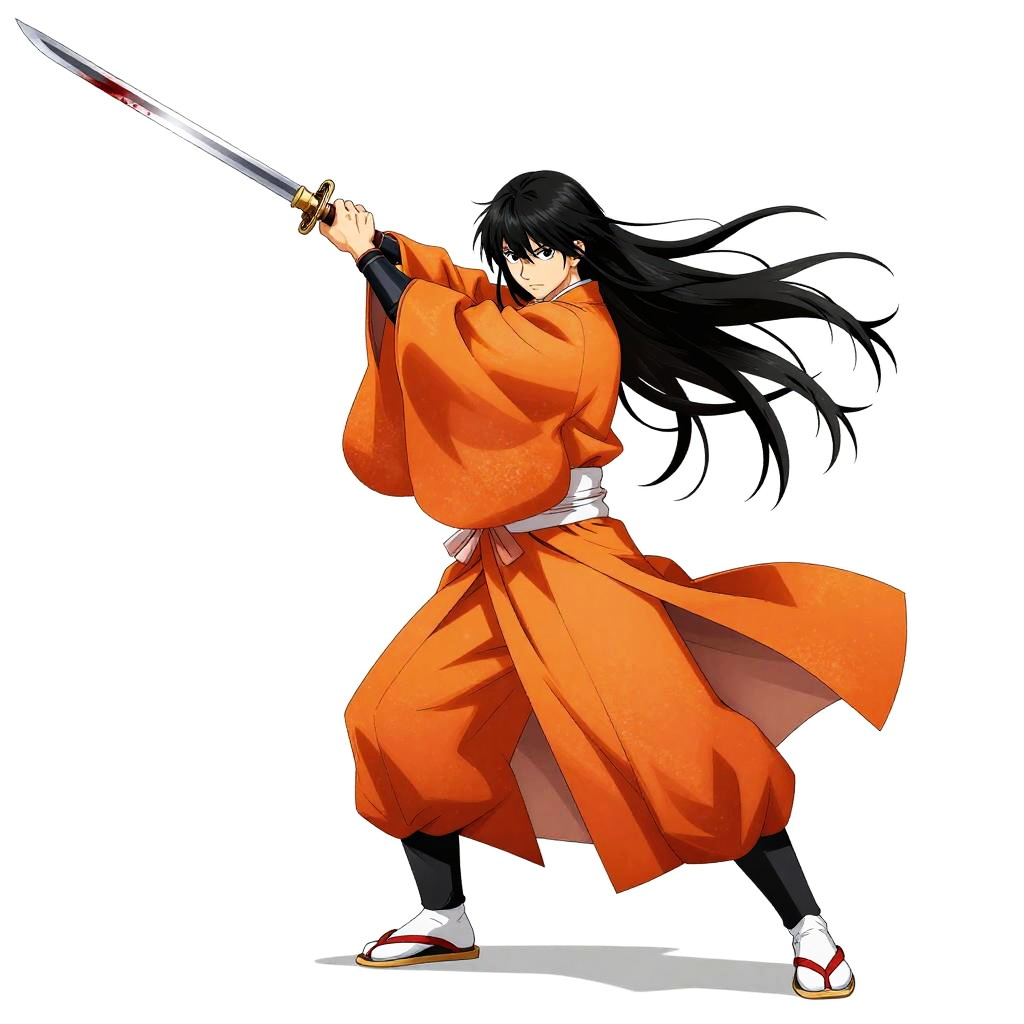 Best quality, masterpiece, ultra high res, (photorealistic:1.4)1girl, weapon, sword, long hair, black hair, holding, white background, solo, holding weapon, blood, holding sword, arm guards, simple background, male focus, blood on weapon, looking at viewer, black eyes, tabi, floating hairfull body, orange, upper body, uchikake (wedding kimono), arms up