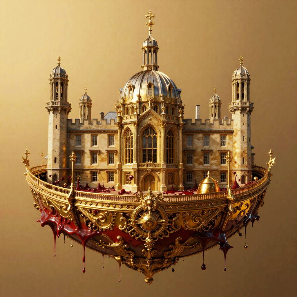 Floating Cambridge made of blood and Iron, art by greg rutkowski, intricate, ultra detailed, photorealistic, two colors, Gold color grading, trending on artstation, 4k, 8k, aesthetics, atmosphere