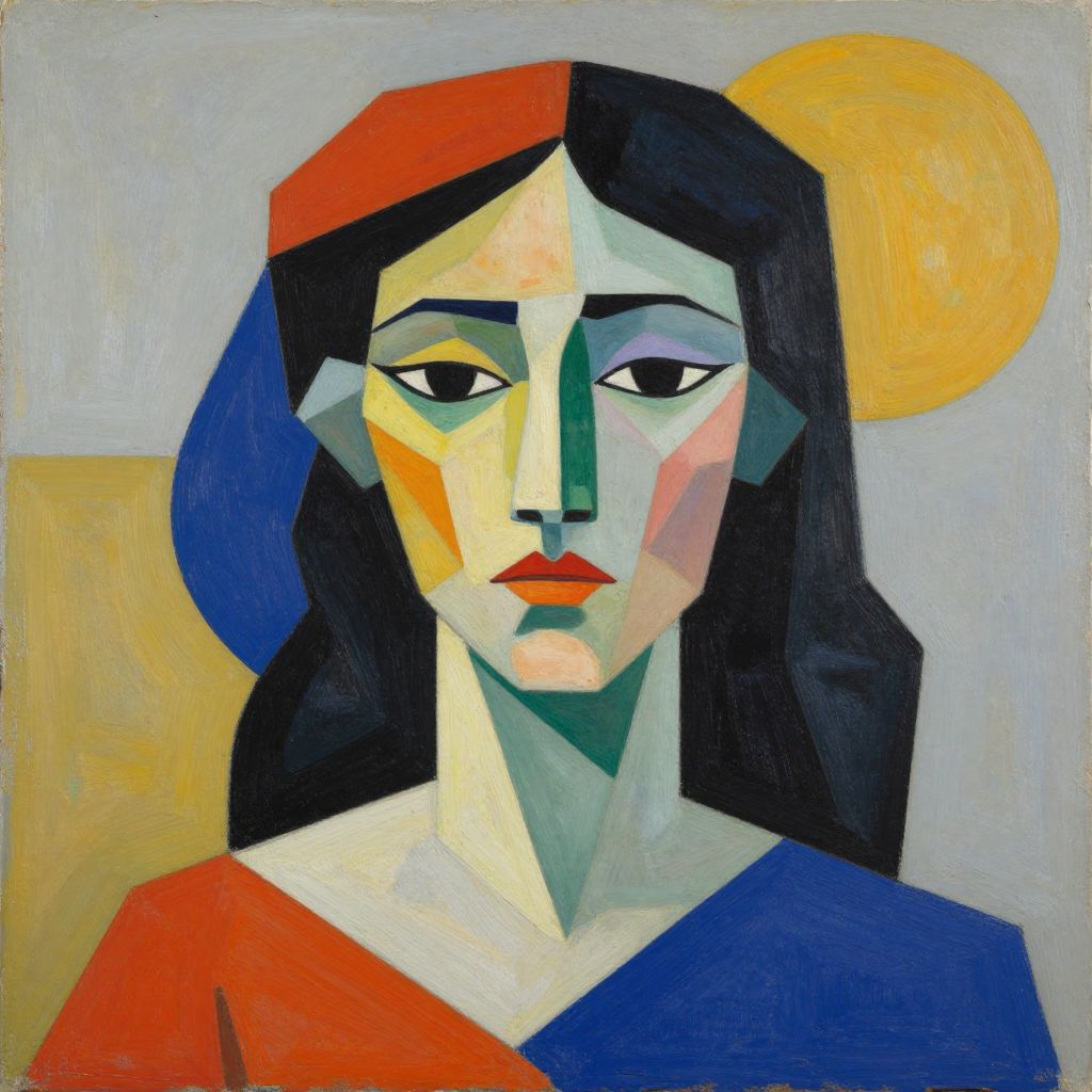 Cubist-style painting of a woman with geometric facial features, red and blue clothing, black hair, and yellow sun halo in background.