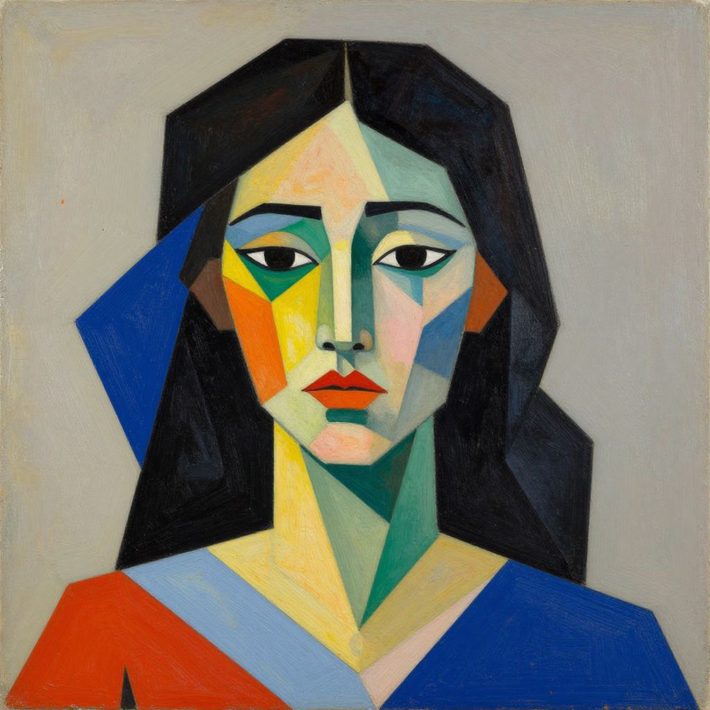Vibrant geometric shapes and bold colors converge in a cubist-inspired portrait, where a woman's face is fragmented into abstract forms, defying conventional perspective and reality.