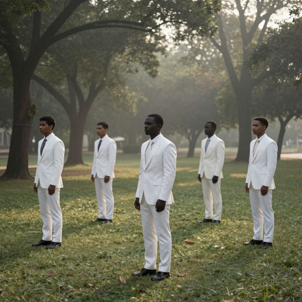 A minimalistic prompt for men in suit standing in a quiet park at dawn, morning light filtering through trees, each man in a clean white suit with subtle patterns, peaceful stillness, and natural atmosphere.