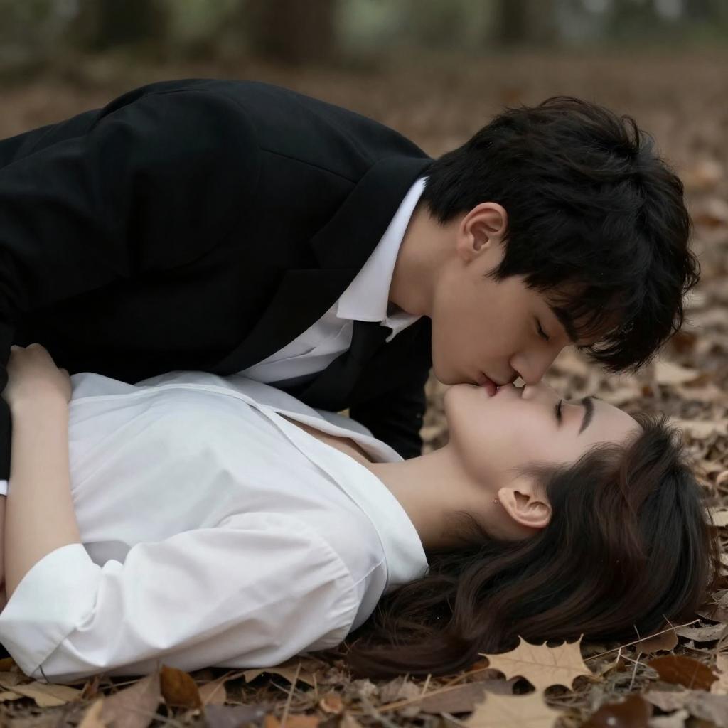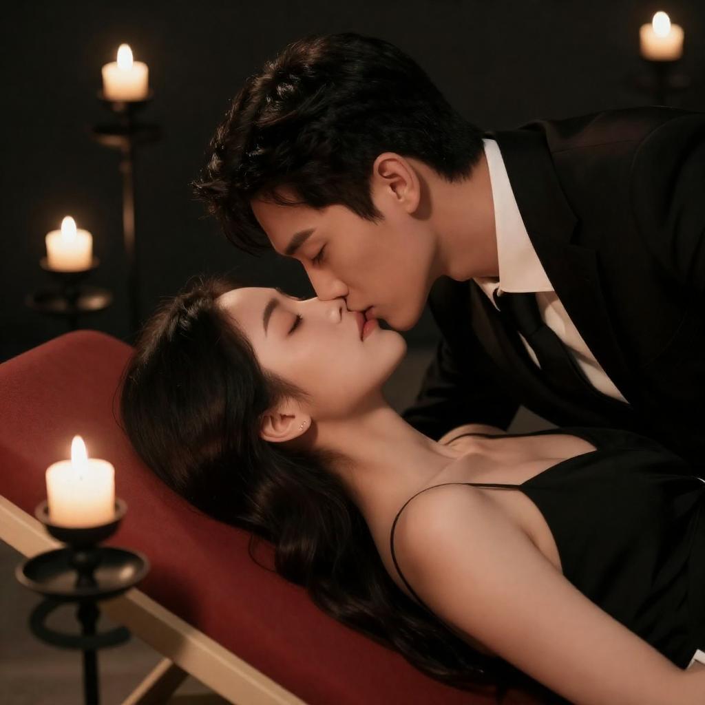 A photograph of a man with dark hair, dressed in a black suit, leaning over a woman with long dark hair, lying on a red chaise lounge. He kisses her forehead, surrounded by black iron candle holders with lit candles. The background is dark with soft light. The woman's face is not visible. The man's expression is focused.