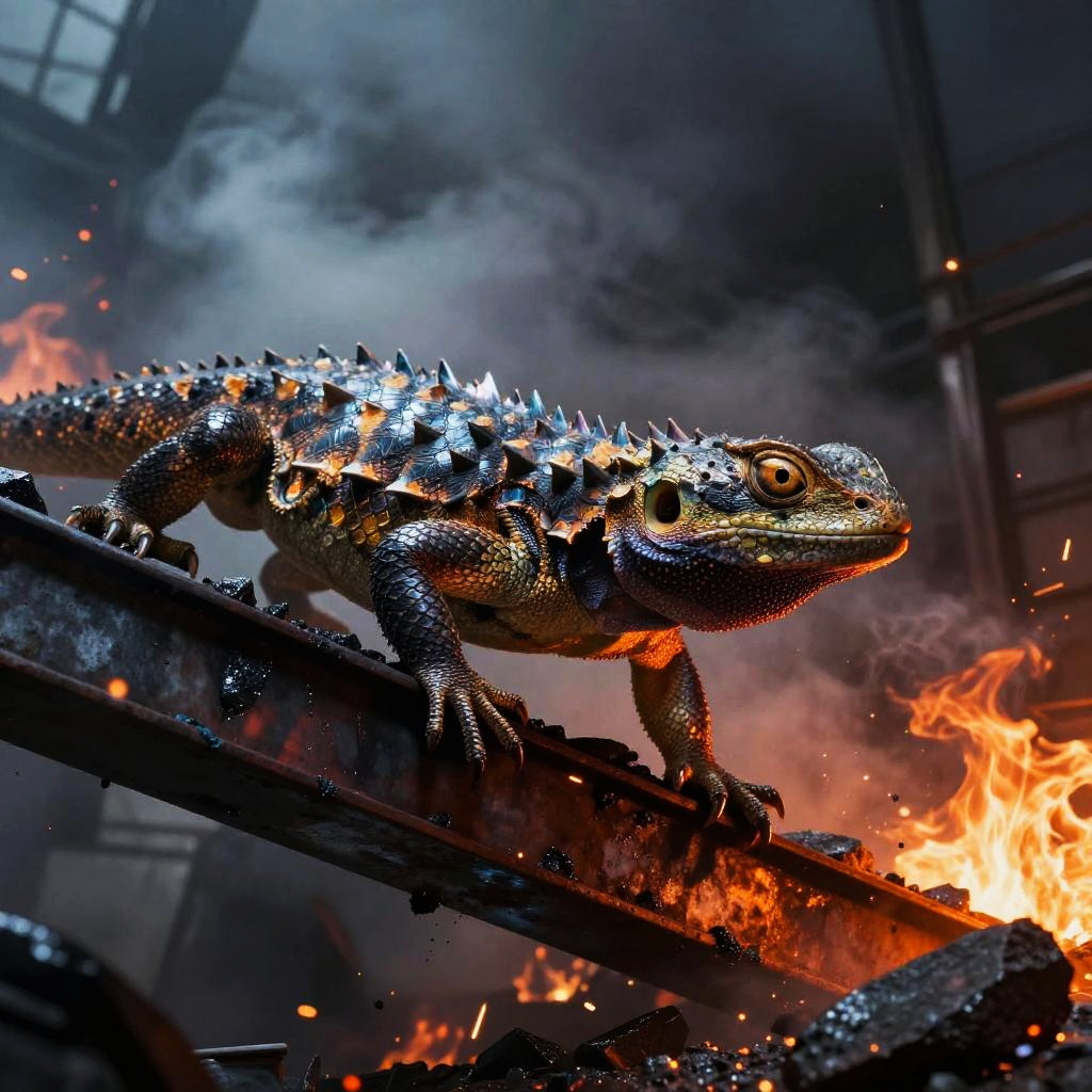 Ember-lizard creature with reflective scales shimmering like hot coal, clinging to a scorch-marked metal beam with sparks flying, ruined factory engulfed in toxic cloud and fire embers, action shot, skin pores, very dark lighting, heavy shadows, detailed face, vibrant, photorealistic, dramatic, sharp focus, 8k, (intricate:1.4), decadent, (highly detailed:1.4), digital painting, concept art, octane render, artstation, smooth illustration, global illumination, studio light, volumetric light, atmospheric fog, particles floating, embers, wet surfaces, rim light, depth of field