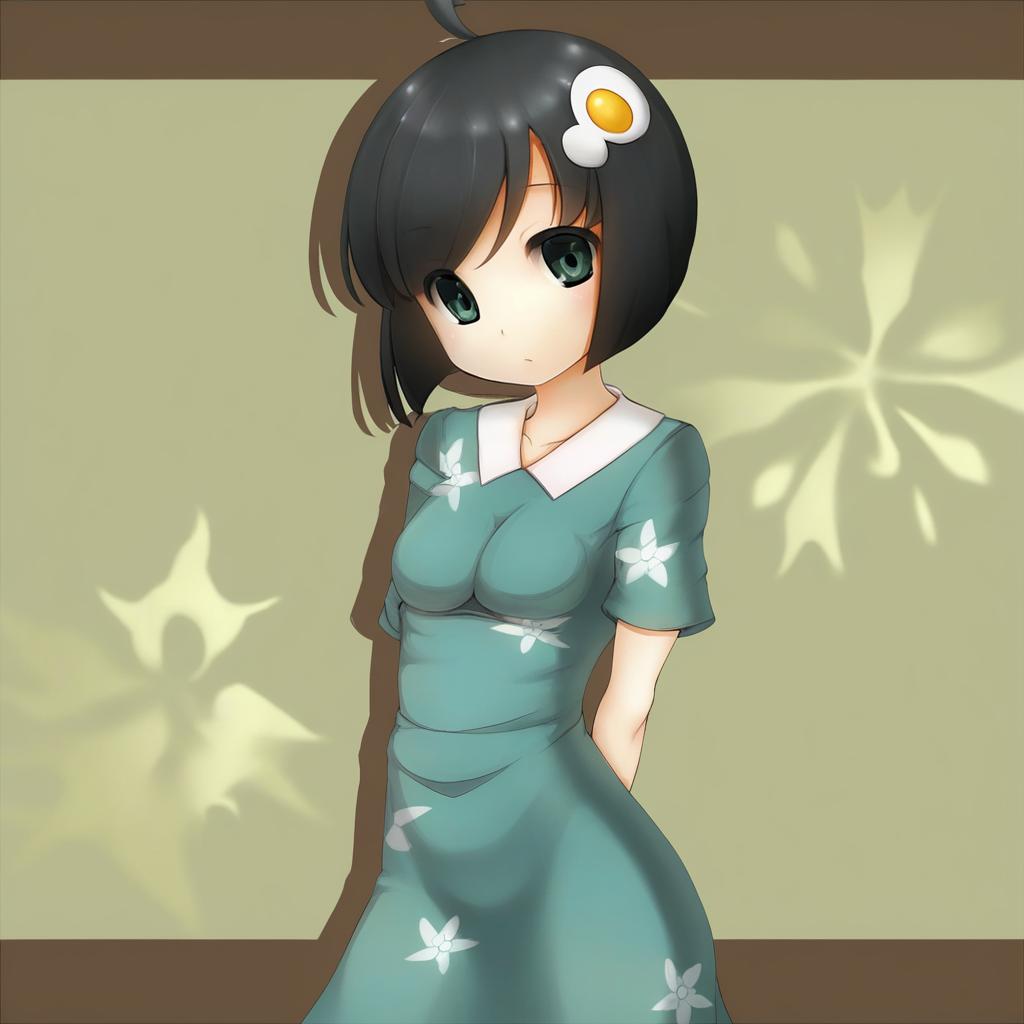 Araragi tsukihi, monogatari (series), 1girl, black eyes, black hair, short hair, egg hair ornament, ahoge, by artist anti (0324), animagine