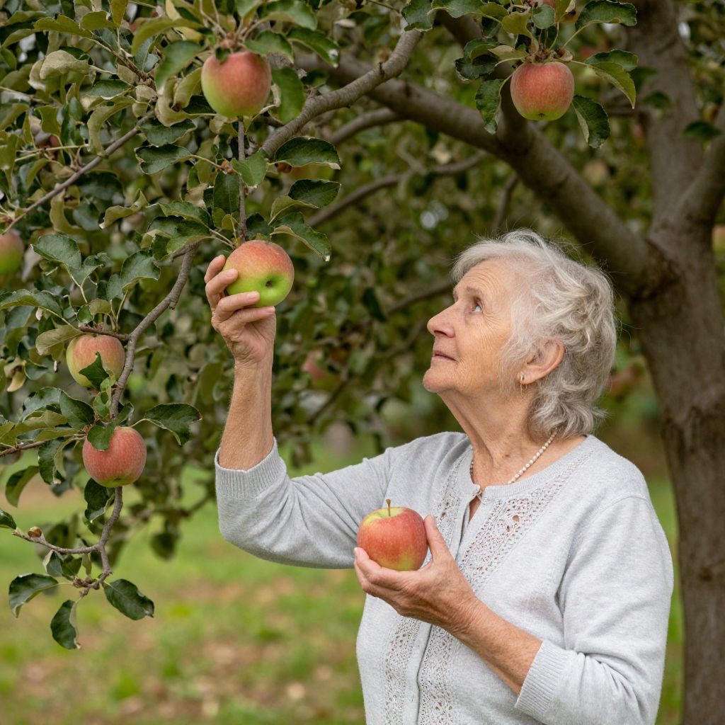 Photograph of an elderly white woman with short gray hair, wearing a white lace blouse, picking apples from a tree in a lush orchard.
