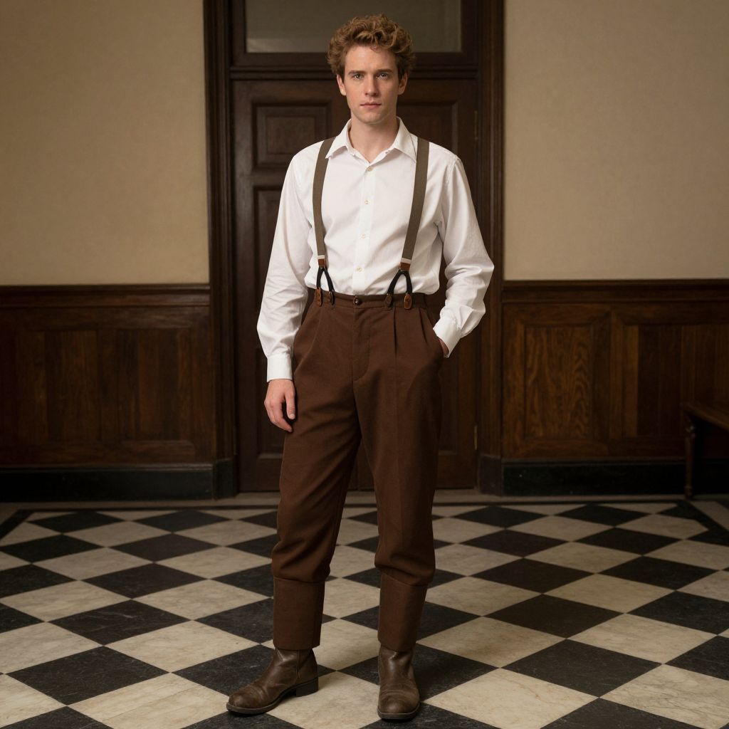 Photograph of a young man with curly brown hair, standing in a room with dark wooden wainscoting and a black-and-white checkered floor. He is wearing a white long-sleeved shirt, brown high-waisted trousers, brown suspenders, and brown leather shoes. His hands are in his trouser pockets, and he has a serious expression. The background features a dark wooden door, and the lighting is soft, creating a vintage, classic ambiance. The style is reminiscent of early 20th-century fashion.