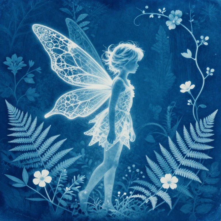 Intricate cyanotype-style artwork capturing a beautiful and delicate pixie in a natural forest setting, The pixie is petite with gossamer wings, standing gracefully among ferns, flowers, and vines, Her silhouette is outlined in fine white details against a rich cyan-blue background, giving a soft, ethereal glow that evokes a dreamy, vintage quality, She has flowing, slightly wavy hair, and her wings are translucent with elaborate, lace-like patterns, The background is filled with subtle botanical details in cyanotype style, enhancing the natural atmosphere with a hand-crafted, botanical illustration look, high details, 4K resolution, soft lighting with a dreamy glow, capturing the enchanting essence of a classic cyanotype photograph