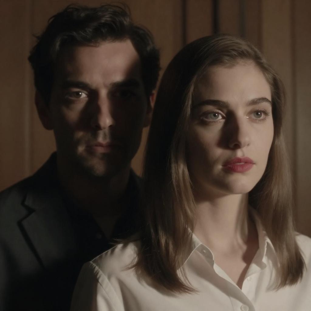 Photograph of a man and woman in a dimly lit wooden room. The man with dark hair and intense gaze is partially shadowed, while the woman with straight, light brown hair and red lipstick wears a white shirt, illuminated by light from the right. They are close together, creating a dramatic contrast between light and shadow.