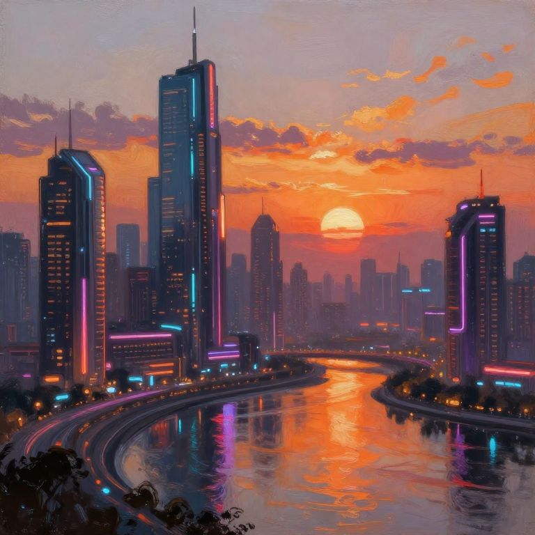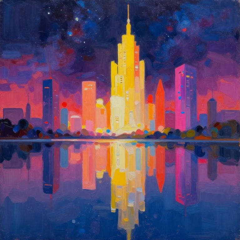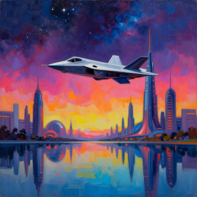 Abstract oil painting, gradient vibrant neon colour, rough, textural, broad brush strokes, a sleek stealth fighter spaceship flying over a futuristic sci-fi city with tall towers skyscrapers, and domes, perfectly reflected in a tranquil, still lake, at night, surreal colours, detailed night sky with stars and nebulas