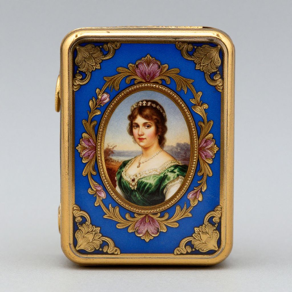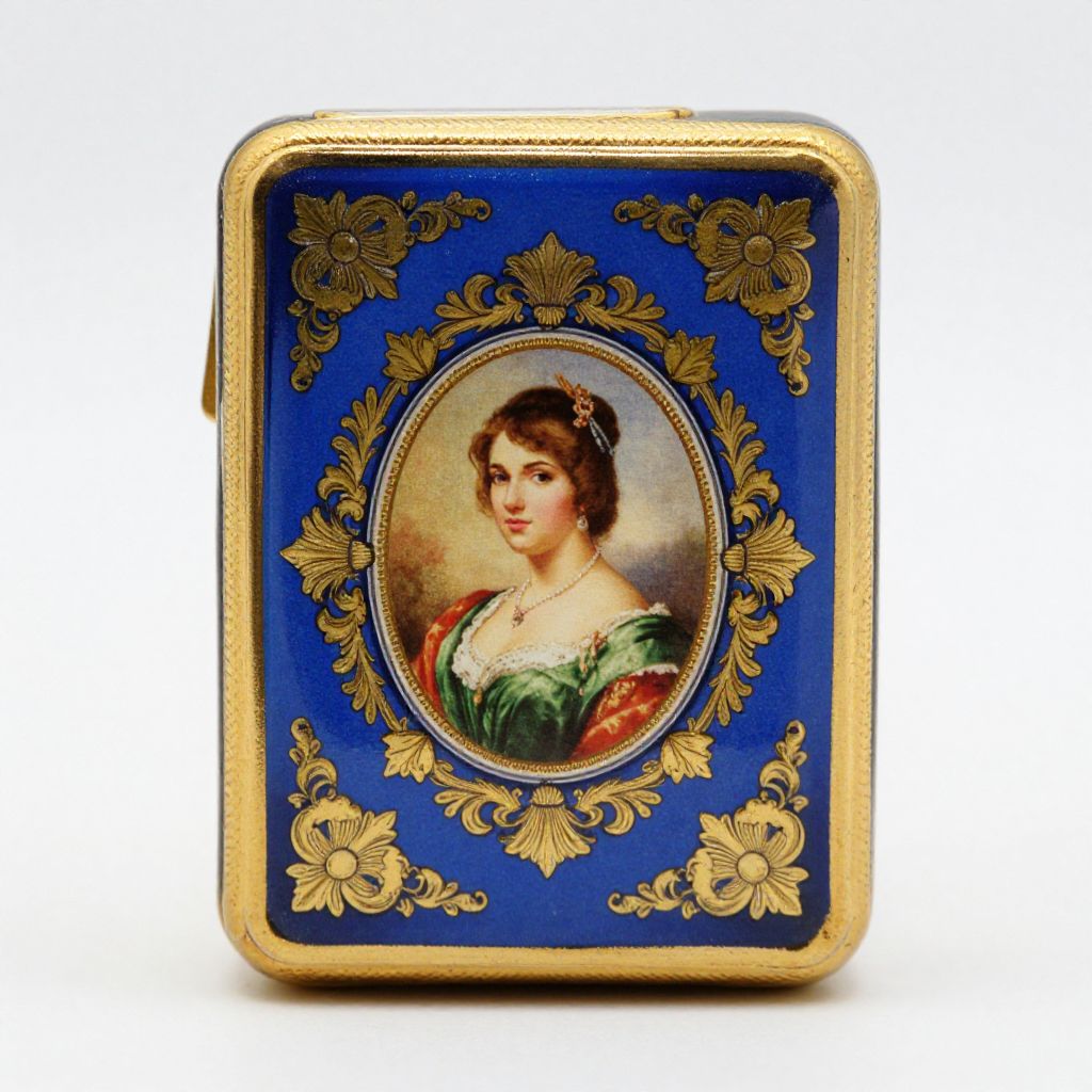 Rectangular Russian enamel cigarette case by Klingert, featuring intricate gold detailing, vibrant blue background, and a central portrait of a woman in green attire, encased within an ornate floral frame.