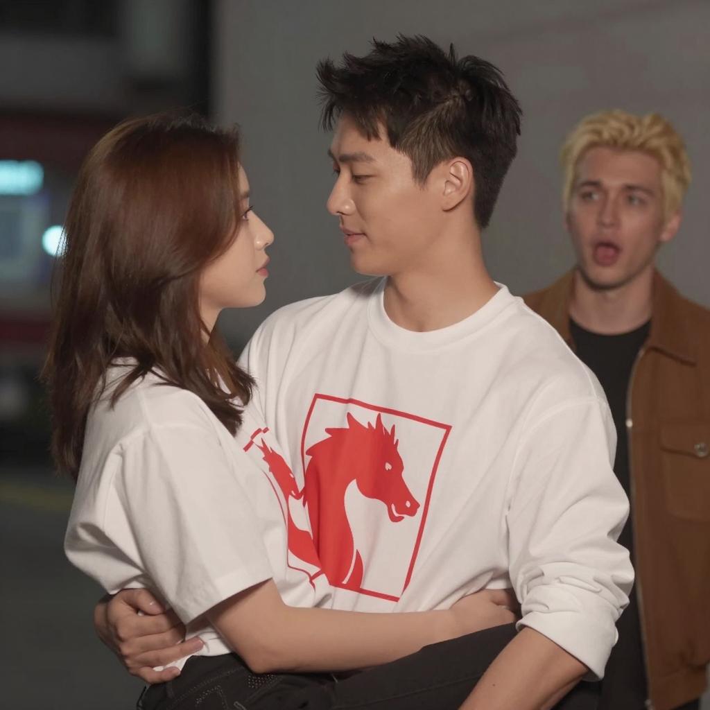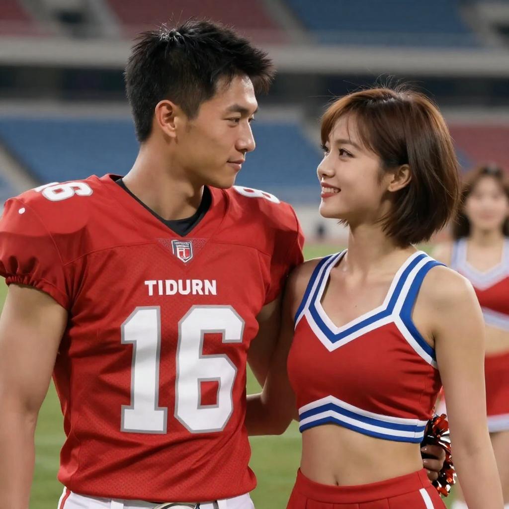Photograph of a man and woman in a stadium. Man with short black hair, wearing a red football jersey number 16, looks at woman. Woman with short brown hair, wearing a red, low-cut cheerleading outfit with blue accents, smiles at him. Blurred cheerleader in background. Stadium seats in background. Both people have light skin. Man and woman face each other, close. Woman's cleavage visible. Bright stadium lighting.