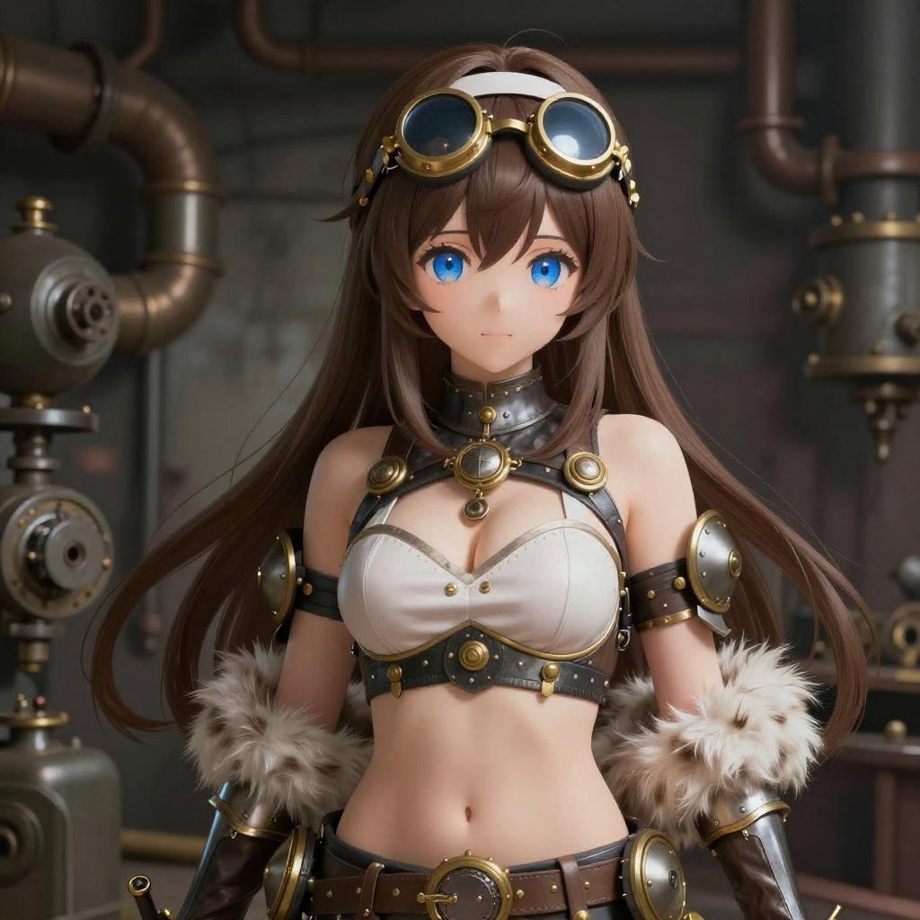 This is a highly detailed digital illustration of a cute, busty anime-style girl with long brown hair and blue eyes, wearing a steampunk-inspired outfit. She has a white headband, gold goggles, and a revealing top that exposes her cleavage and midriff. Her outfit includes metallic armor and fur trims. She's standing in a cluttered, industrial background with pipes and machinery. The art style is realistic with a soft, painterly touch.