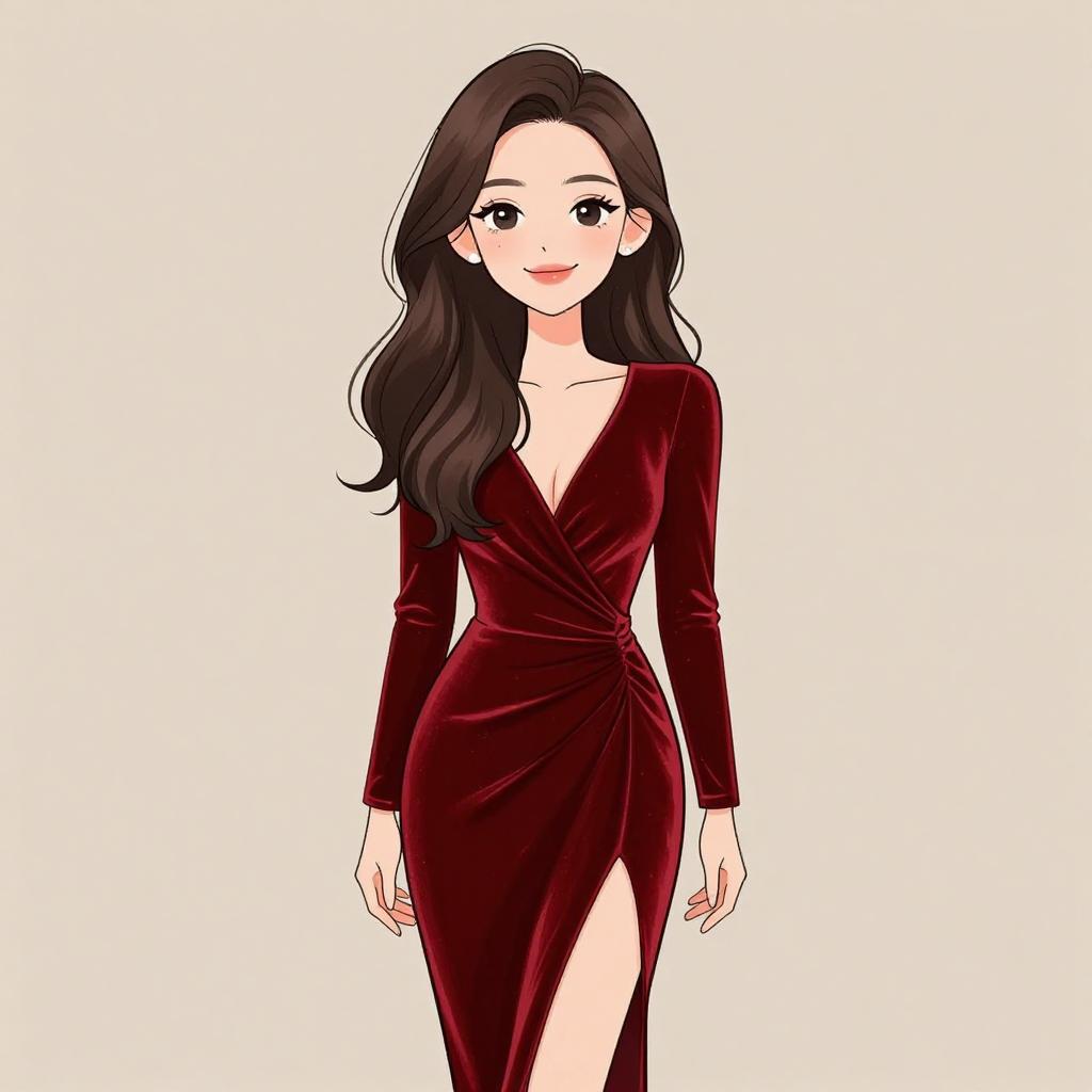 This digital anime-style drawing features a young woman with long, wavy black hair and fair skin. She has large, expressive eyes and a slight smile. She wears a deep red, velvet wrap dress with long sleeves and a high slit on the left side, revealing her left leg. The dress has a V-neck and is tightly fitted, accentuating her slender figure. The background is plain white, making the subject stand out. The image is clean with bold colors and smooth lines, typical of modern anime character illustrations.
