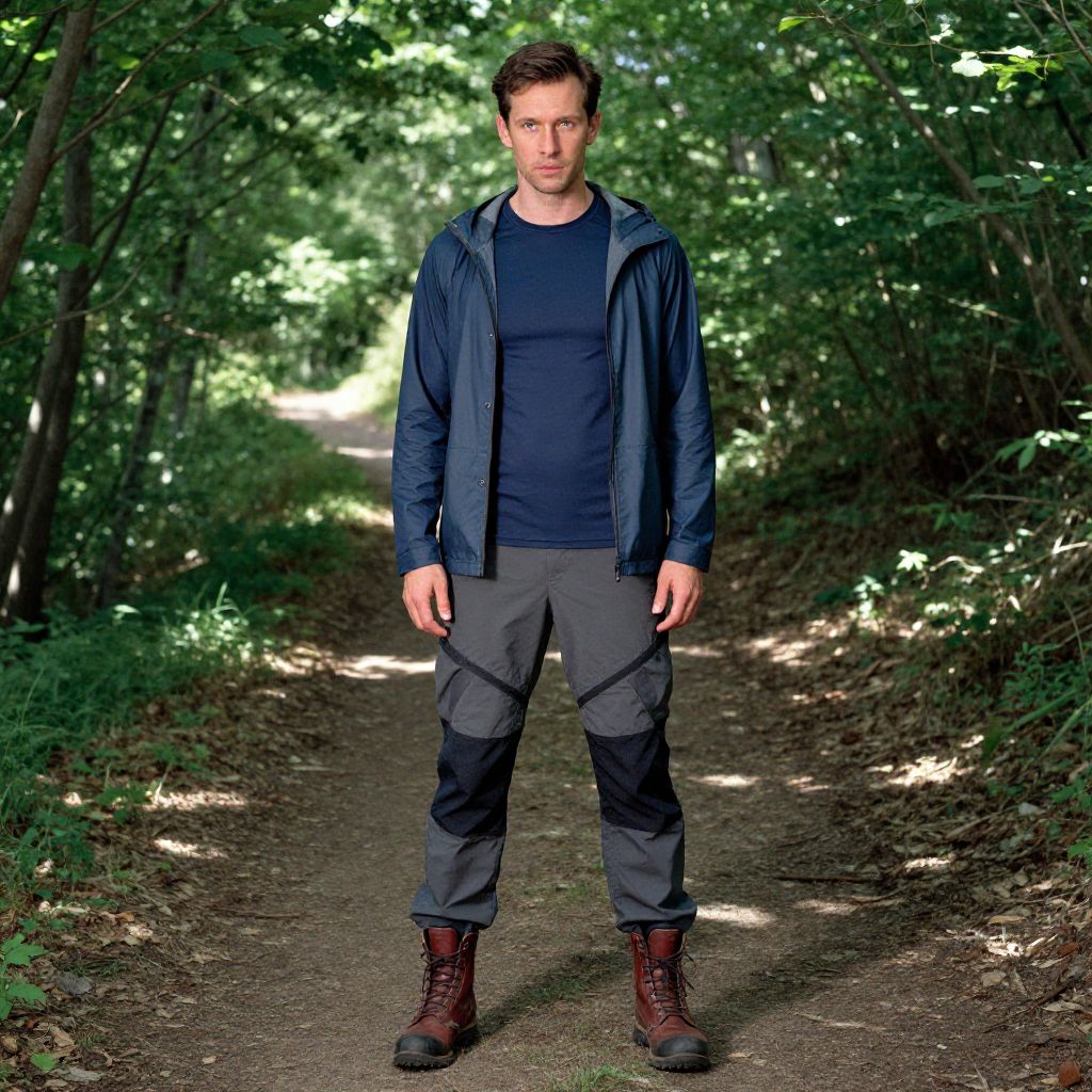 A man, performance long-sleeve base layer, convertible hiking pants, sturdy leather boots, lightweight packable rain jacket, navy blue and charcoal gray, lush green canopy, winding dirt path, dappled sunlight filtering through leaves, eastman film stock, focused expression. Man has masculine face and piercing eyes