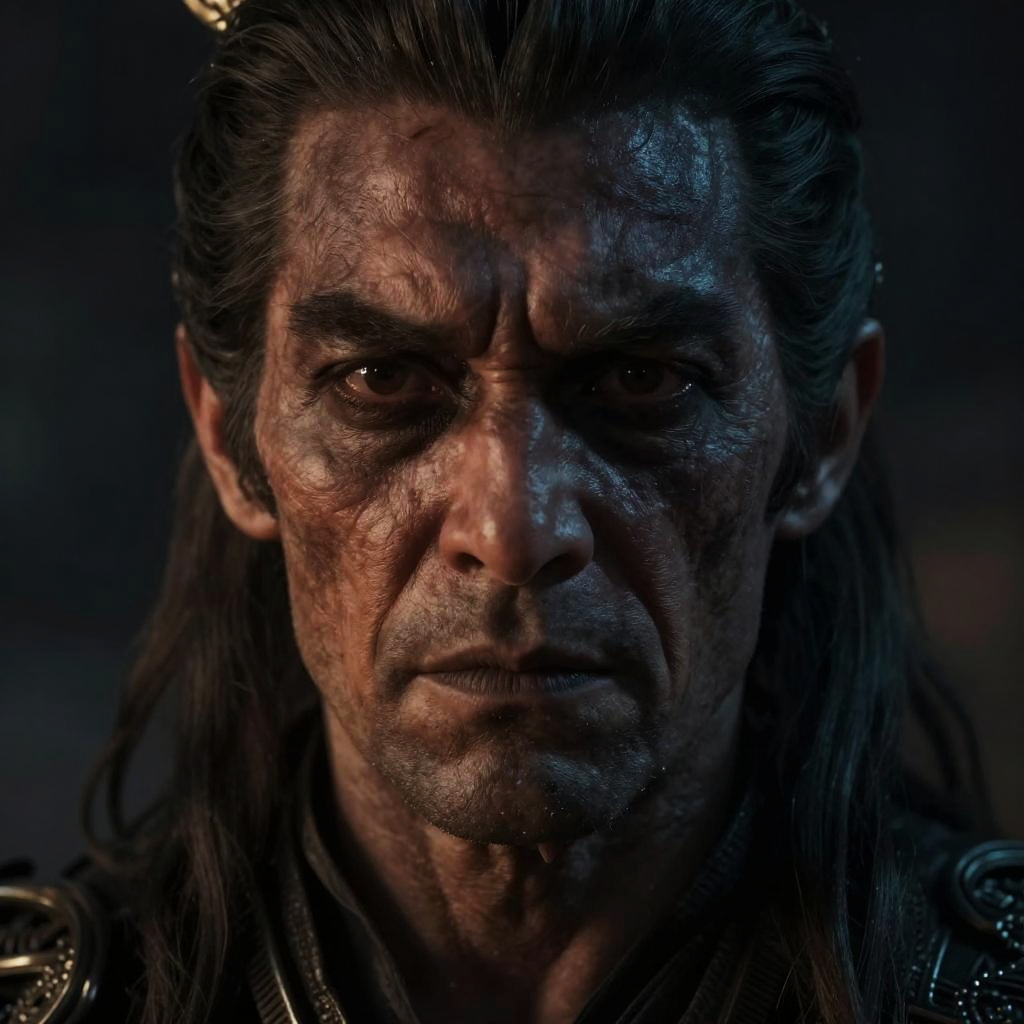 Realistic human 3d model of a fantasy warrior with intricate armor, lifelike skin tone, detailed facial scars and tattoos, dramatic low-key lighting highlighting textures, realistic hair and eye reflections, set in a misty forest environment.