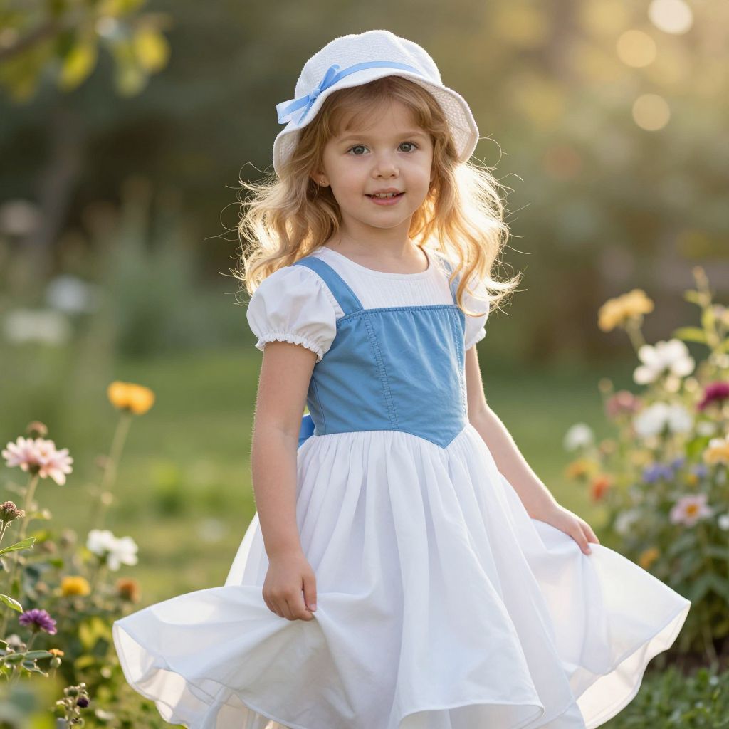 A beautiful young girl with soft, flowing blonde hair, wearing a delicate blue dress adorned with elegant white trim along the sleeves and hem, and a vibrant red bow tied securely on her head. She stands in a sunny meadow, her expression joyful and curious, with a gentle breeze rustling her hair and the dress. The background features a peaceful countryside with blooming flowers and distant hills, adding a warm, inviting atmosphere.