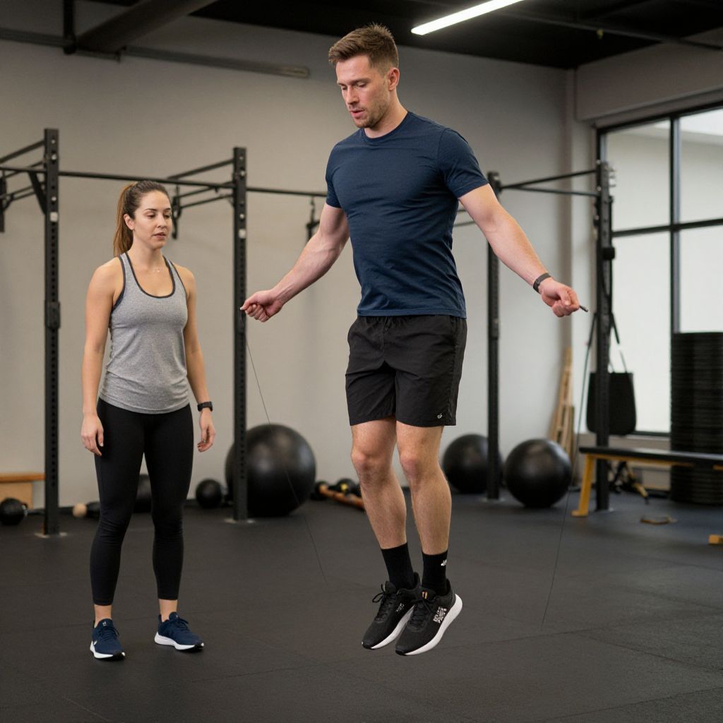 Athletic man performing intense jump rope exercises while a woman in workout attire observes closely in a gym setting.