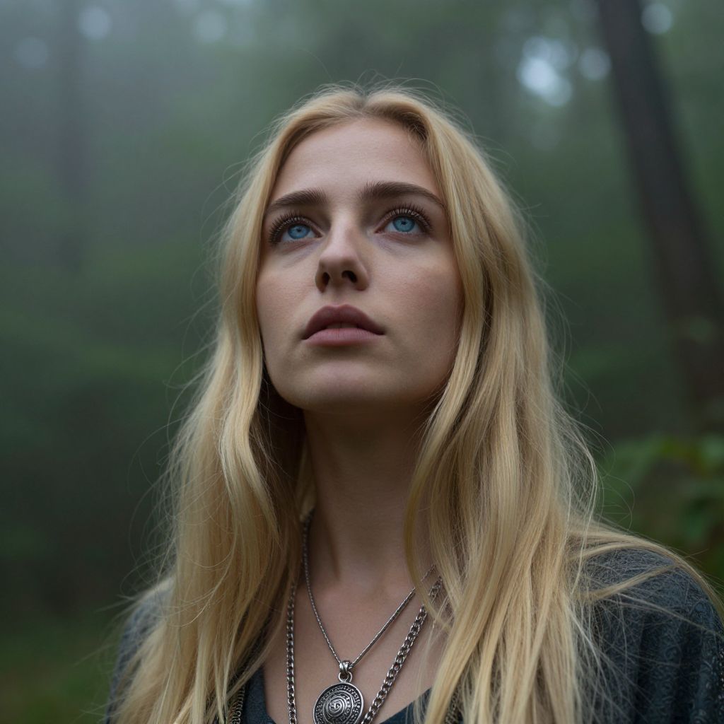 Photograph of a young white woman with long, straight blonde hair and striking blue eyes, looking upward with a serious expression. She wears a silver necklace with a circular pendant and a dark grey top. The background is a misty forest, with blurred green foliage and tall trees. The image has a soft, ethereal quality, emphasizing her fair skin and delicate features against the dark, atmospheric forest. The lighting is natural, highlighting her face and hair.