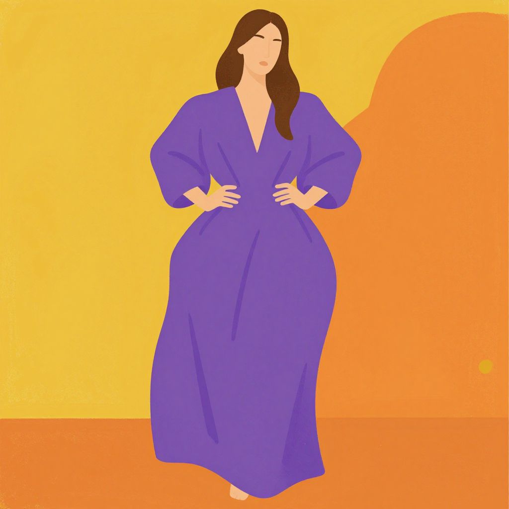 Digital illustration of a plus-sized woman with long brown hair, standing confidently with hands on hips. She wears a deep purple, V-neck, long-sleeved dress that flows to her feet. The background features a gradient from bright yellow to orange, with a large, abstract orange shape on the right. The style is minimalist with bold, flat colors and simple shapes, emphasizing her full figure and the vibrant backdrop.