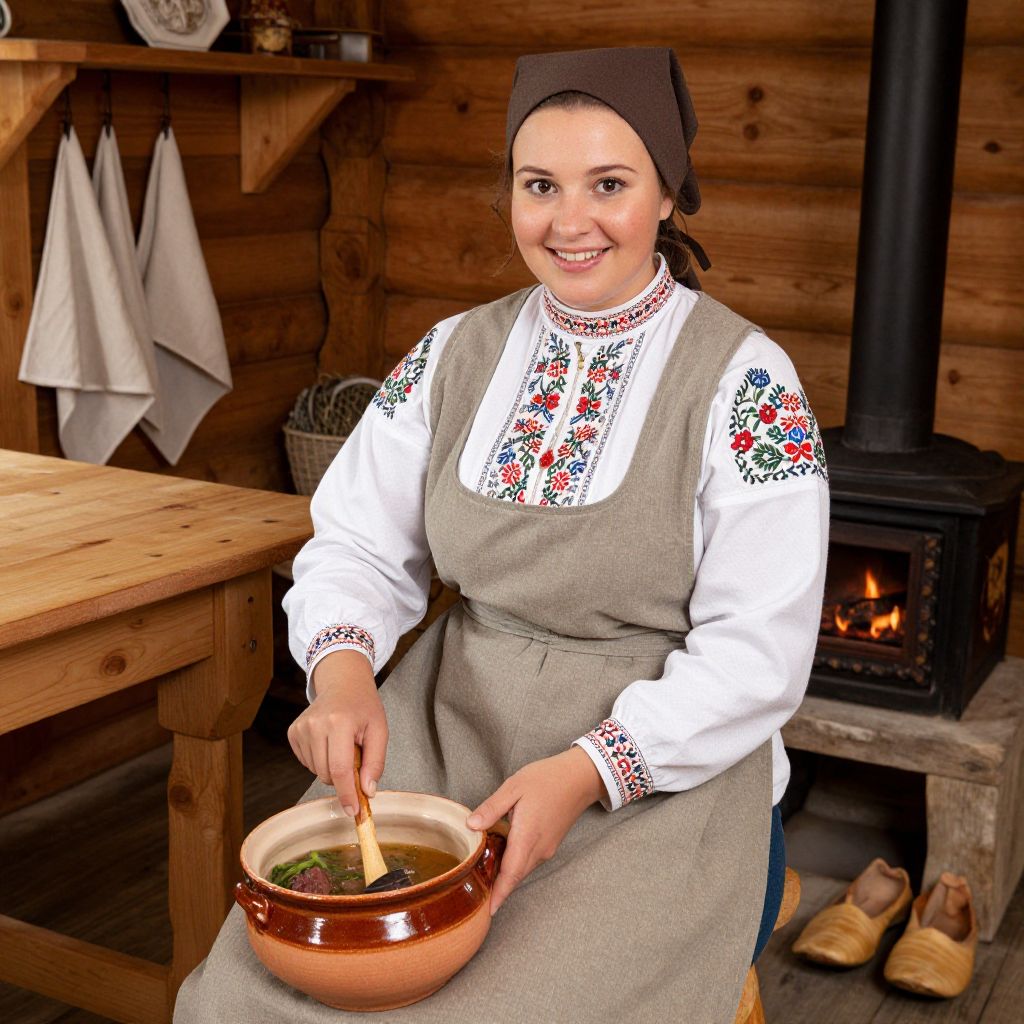 A lifestyle-style photo of a Finnish folk woman in an authentic traditional costume with a simple, elegant apron featuring muted earth tones and floral embroidery, cooking stew in a clay pot in a traditional wooden kitchen, the setting includes a wooden table, hanging linen towels, and a hand-carved stove, her face is youthful and bright with dark brown eyes and a round, friendly demeanor, wearing a simple brown cap and wooden shoes.. The woman has big tits and cute face