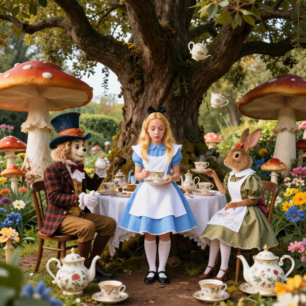 Alice in Wonderland tea party scene, whimsical garden setting under a sprawling tree, vibrant colors with oversized mushrooms and teapots, characters like the Mad Hatter and March Hare in eccentric attire, surreal and dreamlike atmosphere with floating teacups