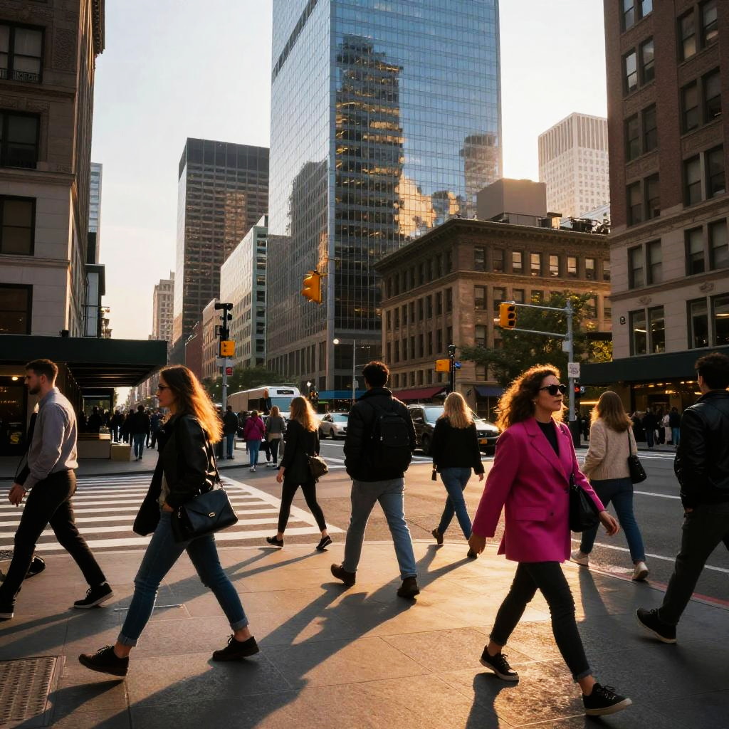 Urban flash scene highlighting a busy metropolitan intersection during golden hour, dramatic sunlight casting long shadows, pedestrians moving quickly with vibrant fashion styles, mix of glass skyscrapers and historic buildings, lively and bustling city atmosphere.