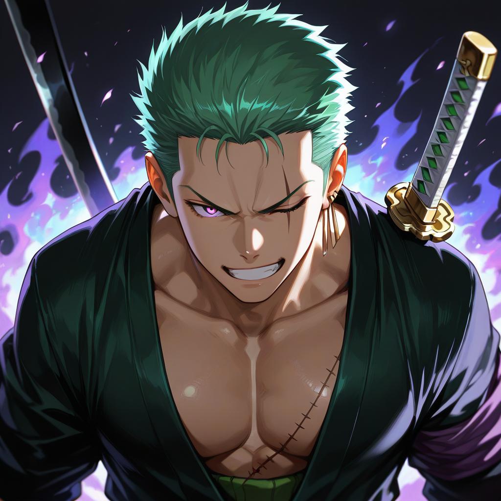 1boy, wanostyle, roronoa zoro, angry looking, katana, (one eye closed), scar across eye, solo, upper body, (((masterpiece))), ((best quality)), (extremely detailed), watercolor, illustration, depth of field, sketch, dark intense shadows, sharp focus, soft lighting, hdr, colorful, good composition, purple fire all around, spectacular, green hair