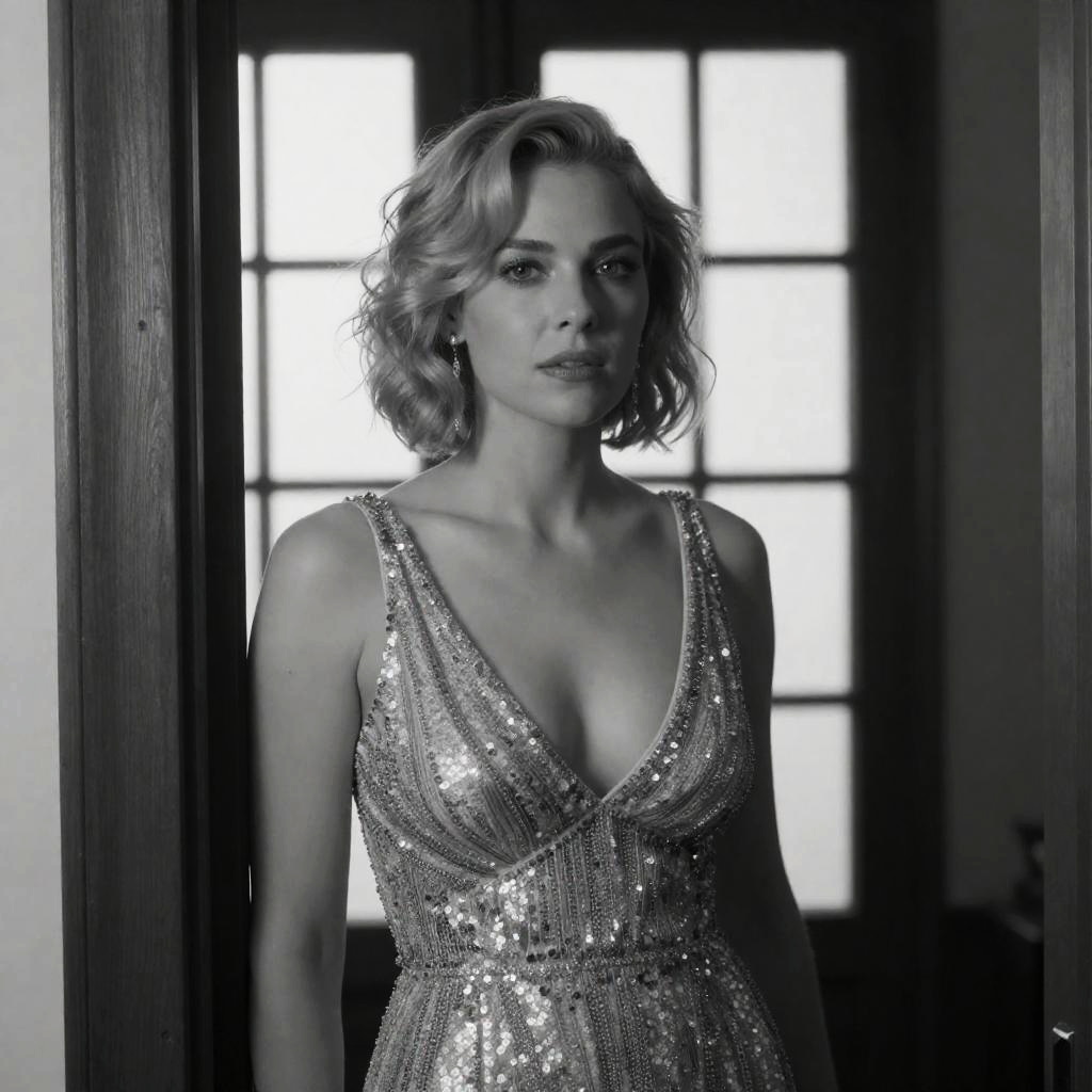 Black-and-white photograph of a woman with wavy blonde hair, intense gaze, wearing a dark cardigan with white straps. Background includes a ured wall, black lamp, and striped curtains. Woman centered, upper body visible.