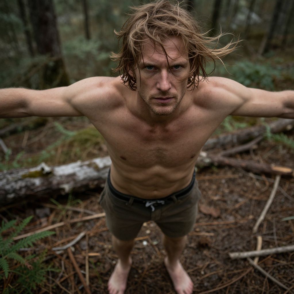 Photograph of a shirtless, muscular man with wet, disheveled brown hair, wearing gray shorts, standing in a forest with outstretched