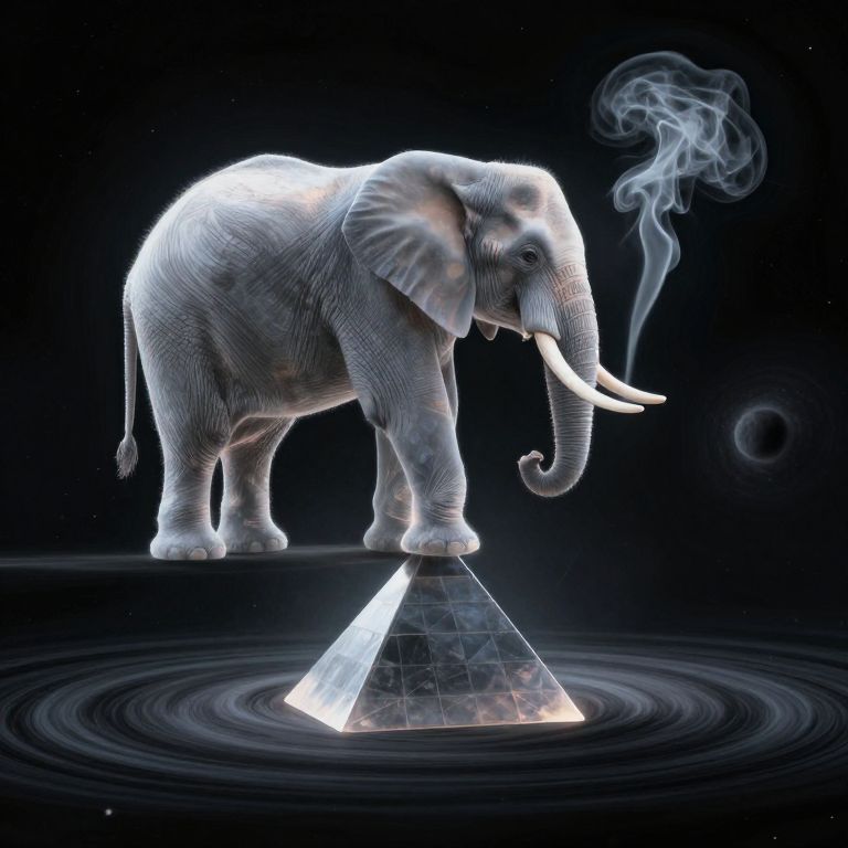 Digital artwork of a glowing white elephant smoking, standing on a triangular glass pyramid with ripples in a black, starry space.