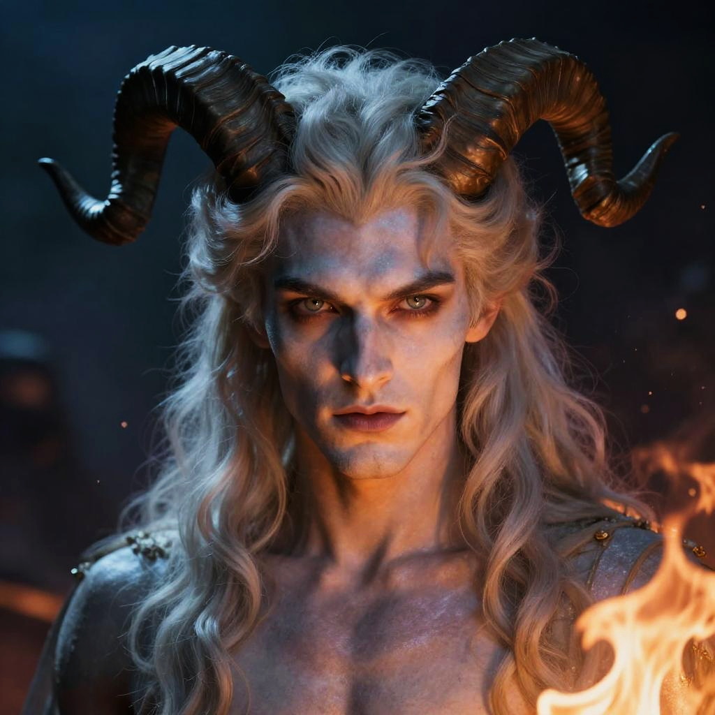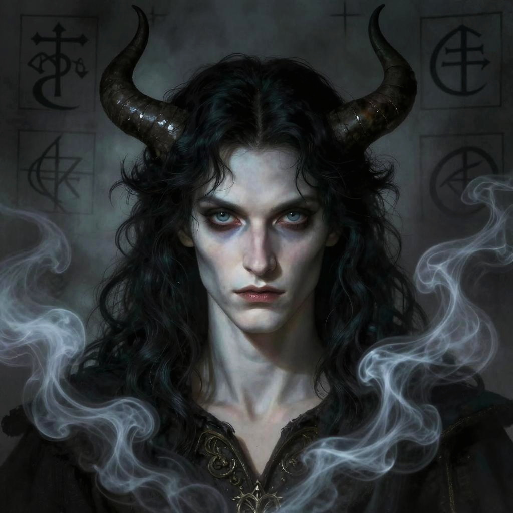 Digital artwork of a pale, blue-eyed demon with black curly hair, black horns, and swirling white smoke, wearing a dark, ornate robe.
