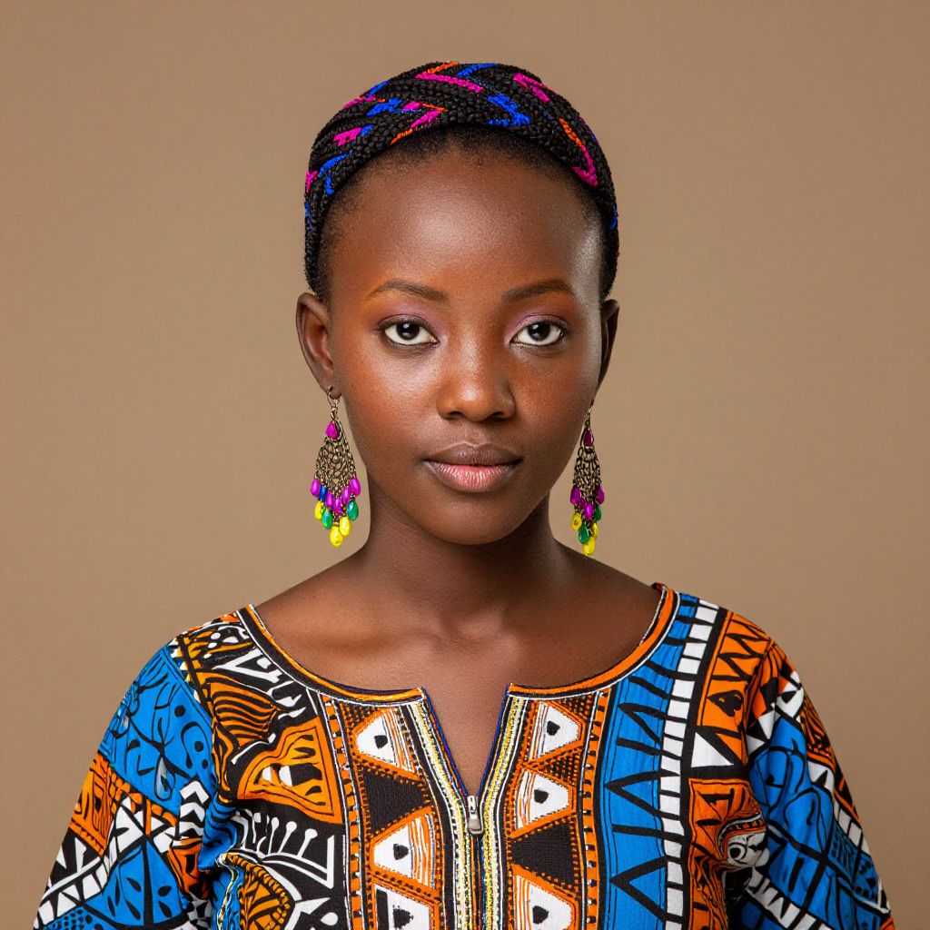 Photograph of a dark-skinned woman with braided hair, wearing colorful geometric-patterned dress and vibrant dangling earrings, against a beige background.
