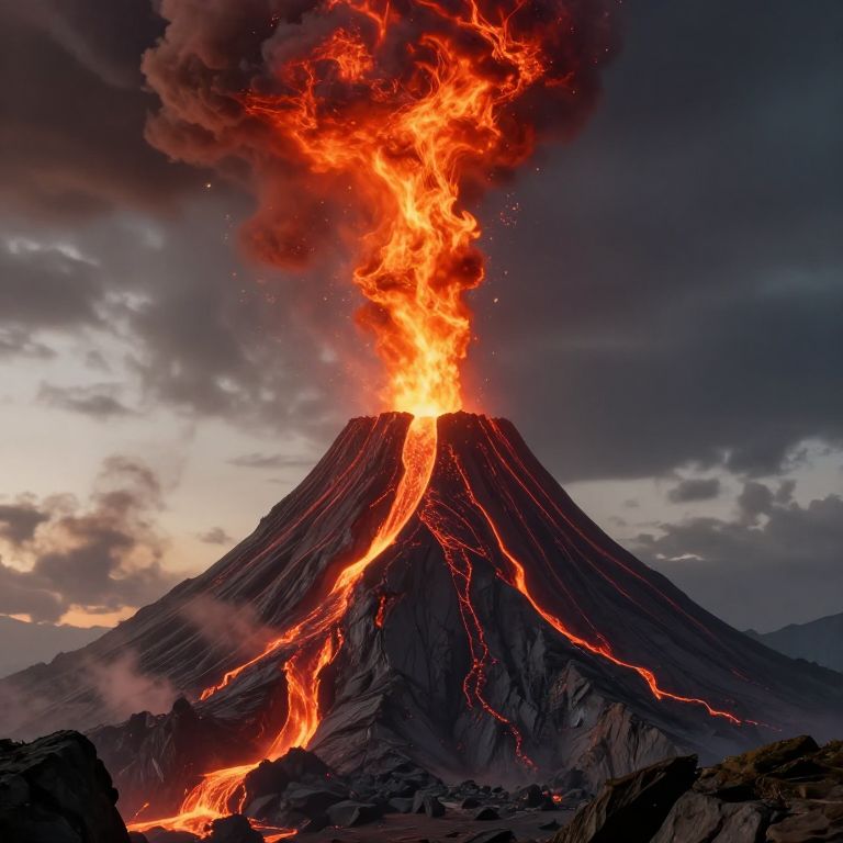 Dnd ai map generator crafting a volcanic island map featuring lava flows, smoke plumes, rugged cliffs and ancient temples, dramatic red and orange color palette, aerial view with dynamic lighting creating intense shadows, detailed terrain for fantasy exploration