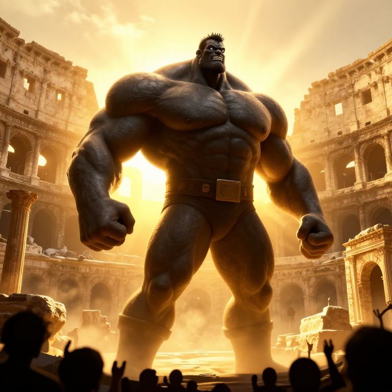 Giant black bodybuilder posing in an ancient coliseum engulfed in golden sunlight, surrounded by ancient ruins and cheering crowd silhouettes, powerful and heroic atmosphere, ultra-detailed character with realistic textures