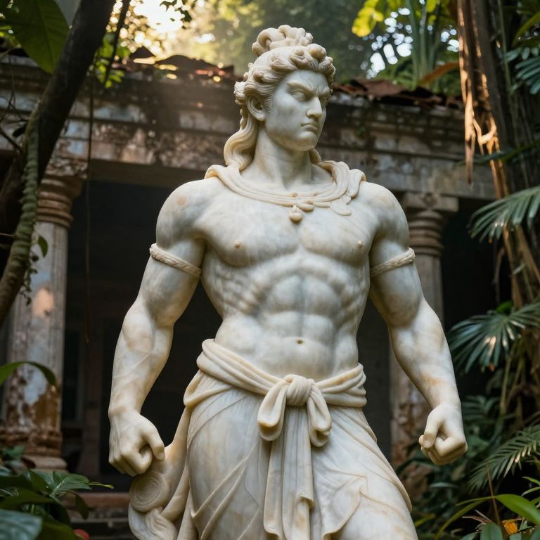 Photograph of a white marble statue of a muscular, male deity with an athletic build, standing in a lush, jungle-like setting. The statue features detailed, flowing hair, a calm facial expression, and a decorative headpiece. He is adorned with a necklace and an arm band, and his lower body is wrapped in a draped cloth tied at the waist. The background includes ancient, weathered stone architecture and dense, green foliage. Light filters through the leaves, casting dappled shadows on the statue. The image has a realistic, high-detail style with vibrant colors and sharp contrasts.
