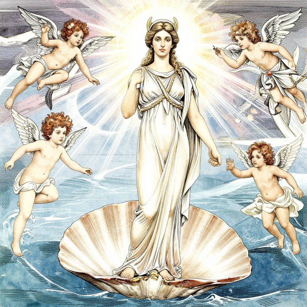 Greek goddess Aphrodite drawing featuring her in a flowing draped gown standing on a seashell, radiant with divine light, surrounded by cherubs and ocean waves, rendered in elegant ink lines with a blend of realism and mythological symbolism.